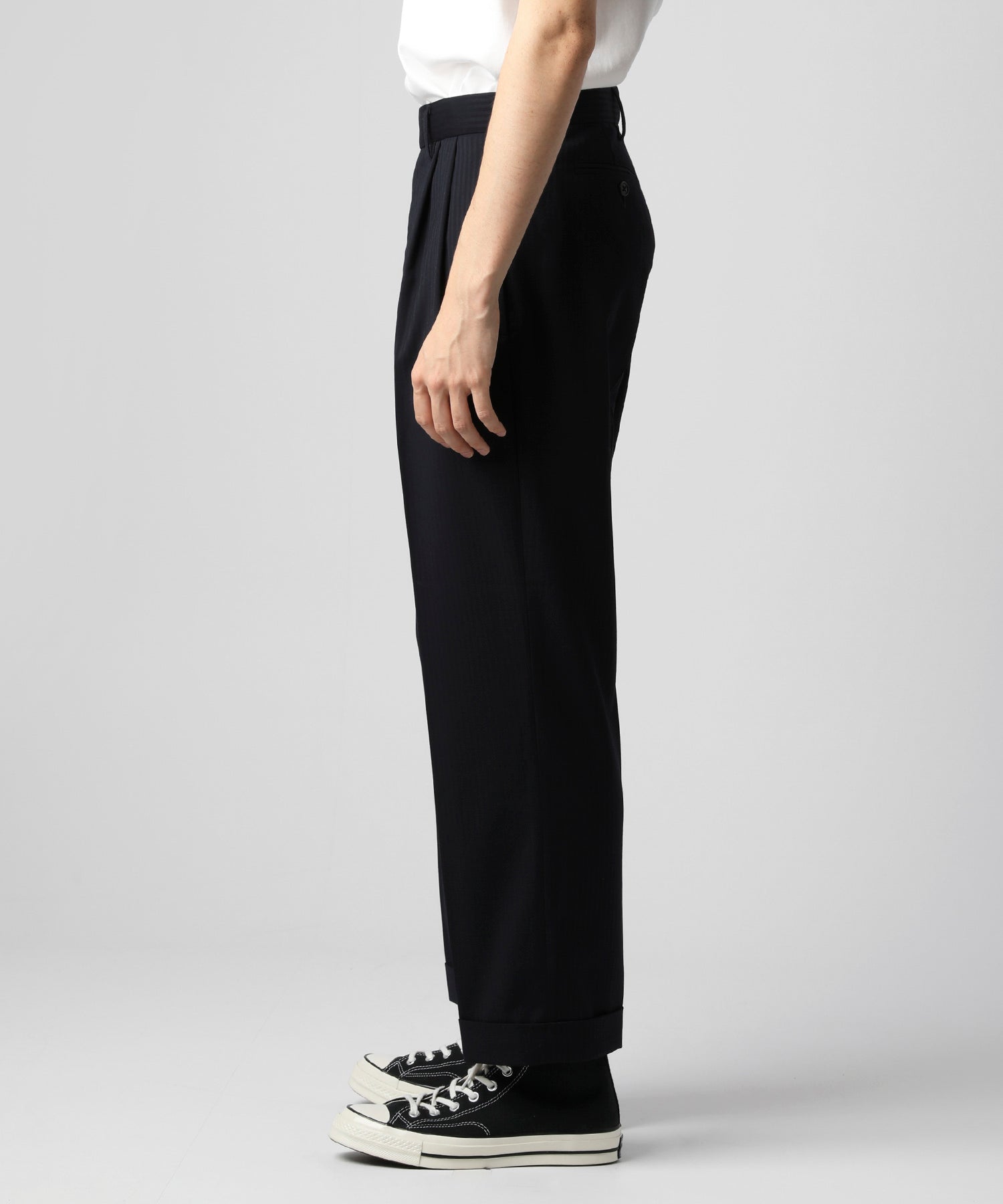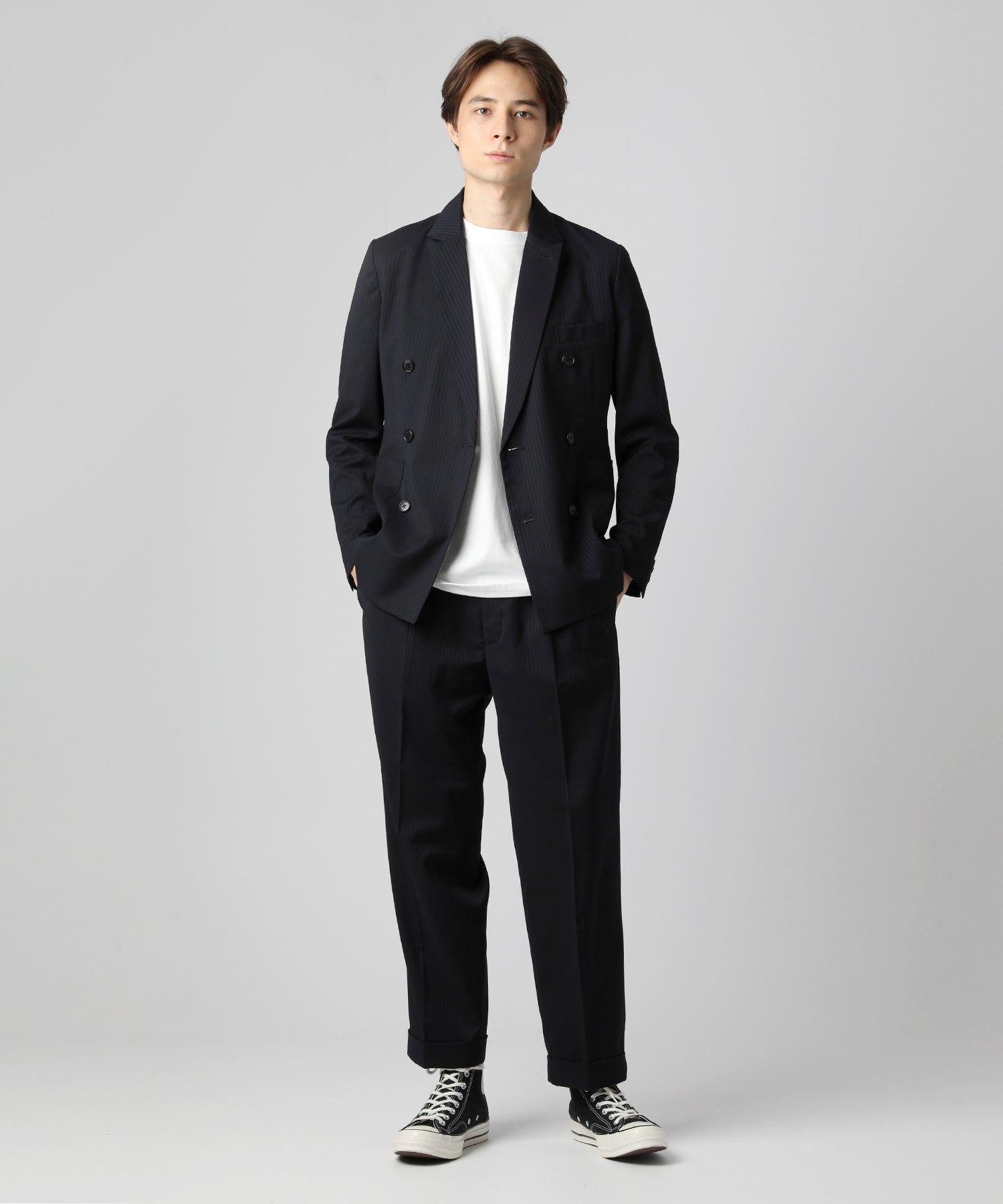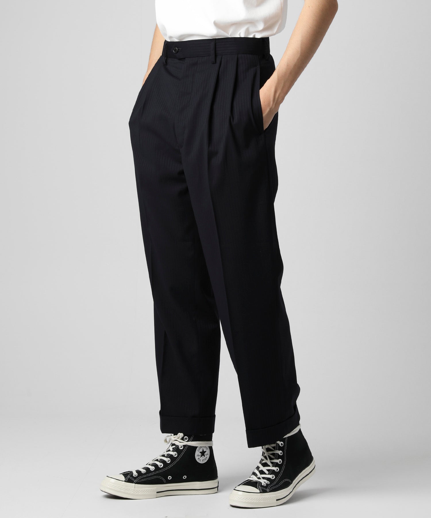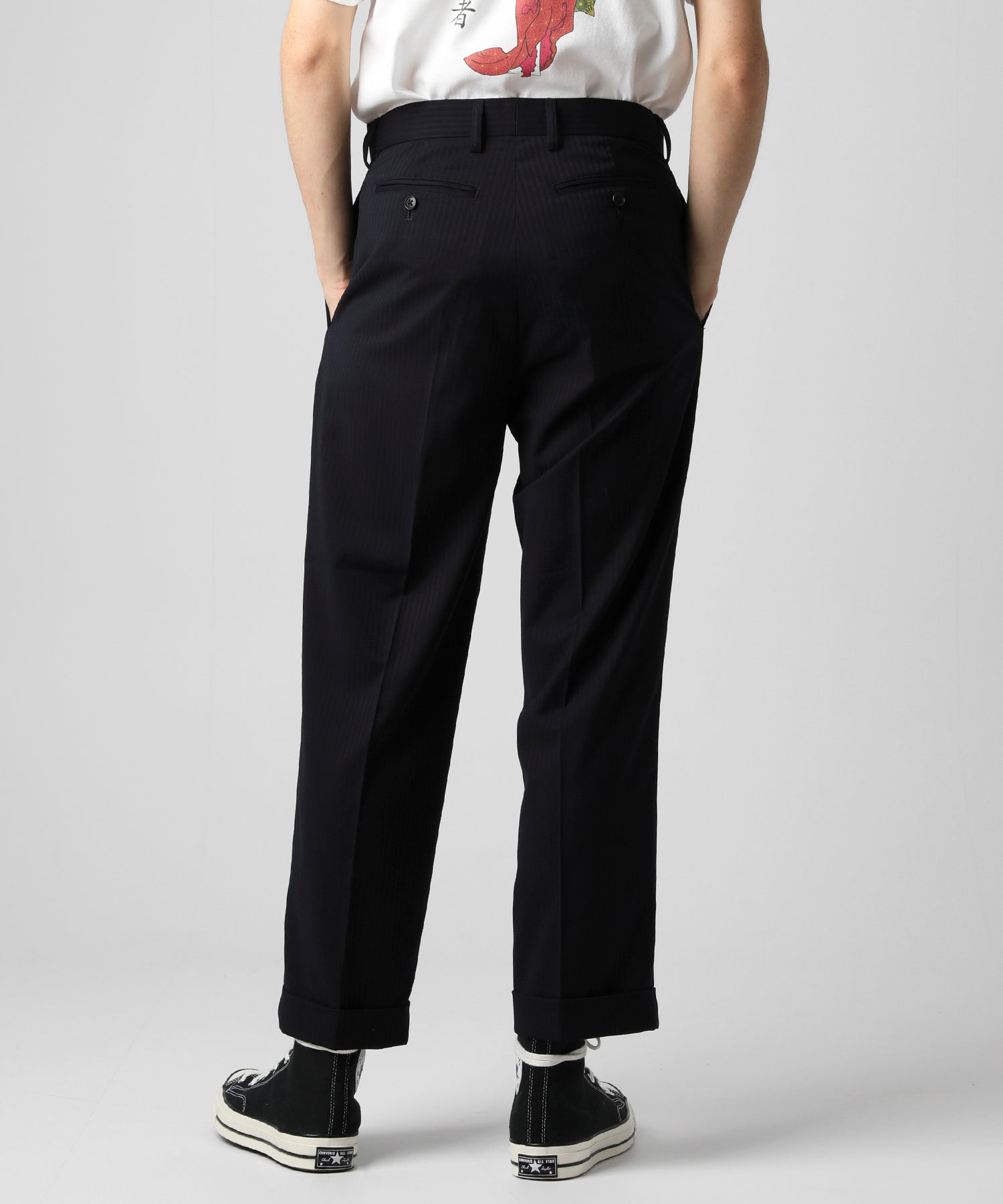 同系色のストライプ柄にすることでワイドパンツでも足がきれいに見えるデザインに仕上がっています。