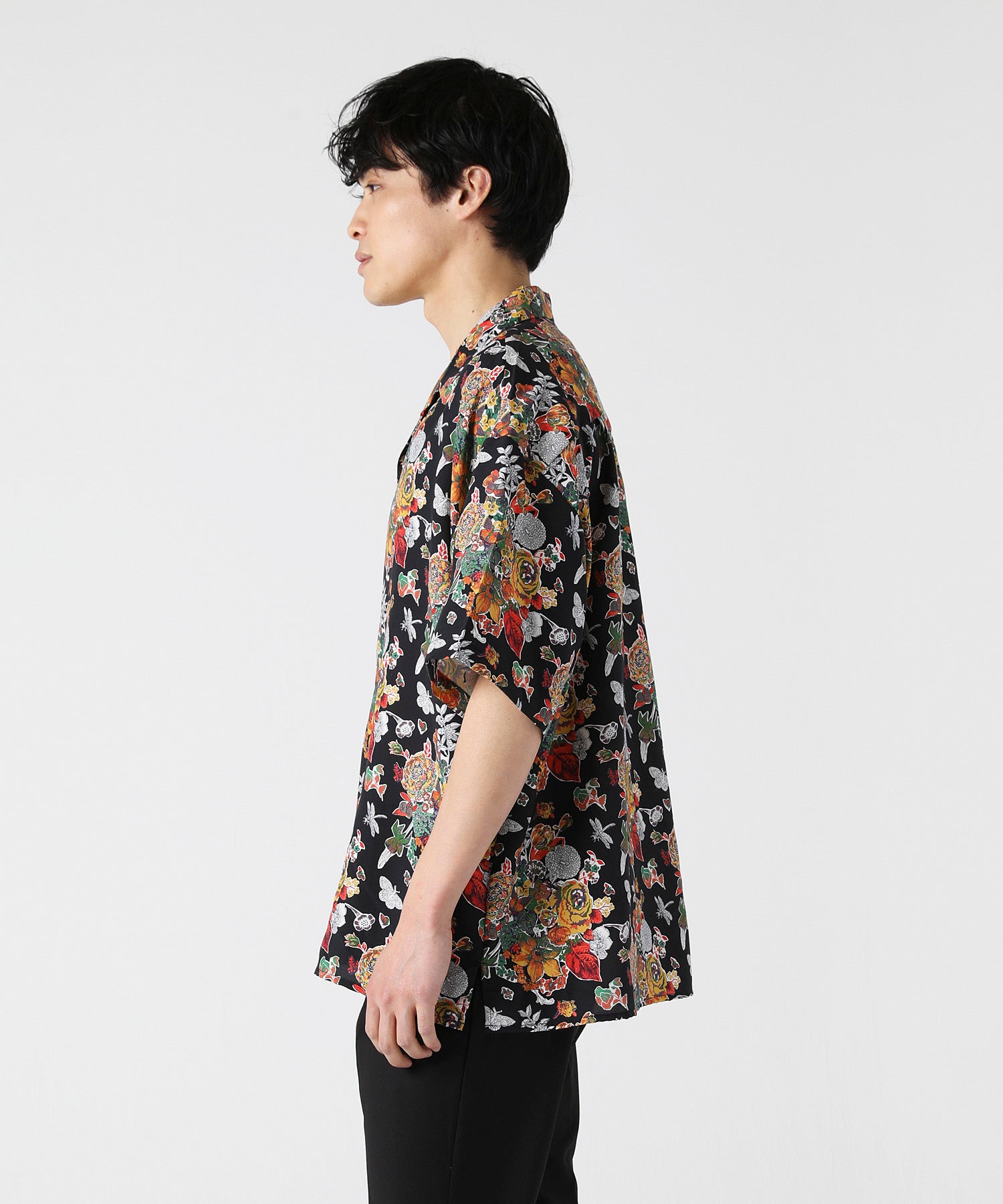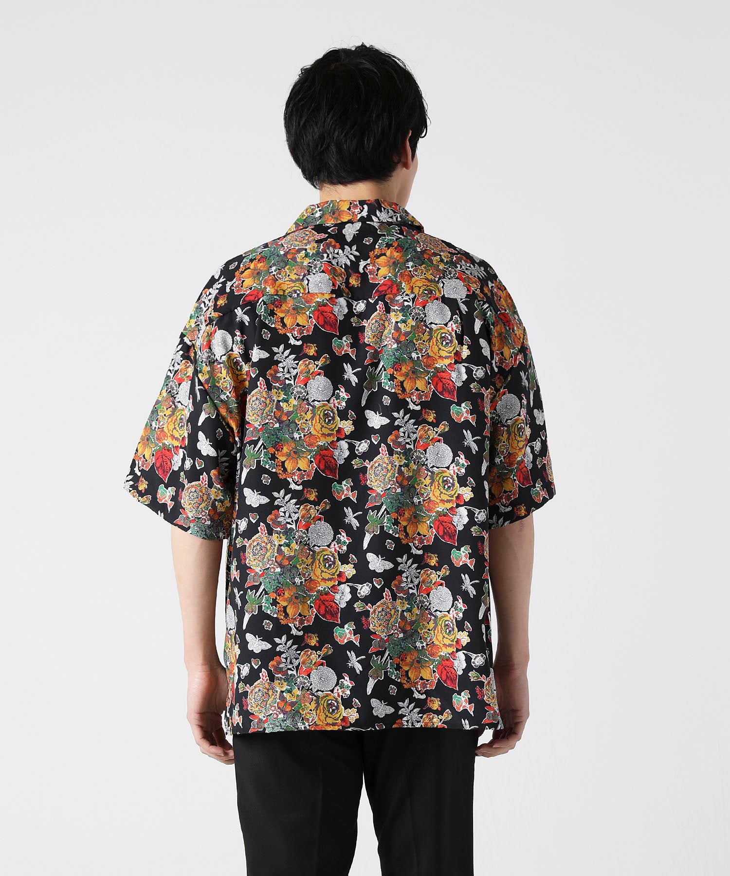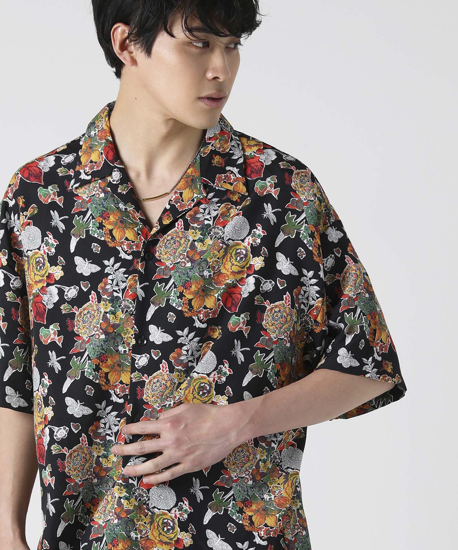 さらっとした肌触りで着心地の良いオープンカラータイプのシャツ。表面に花柄をベースに蝶等を取り入れたデザインをプリントで総柄で落とし込みしっかりとした存在感ながら落ち着きのある仕上がり。