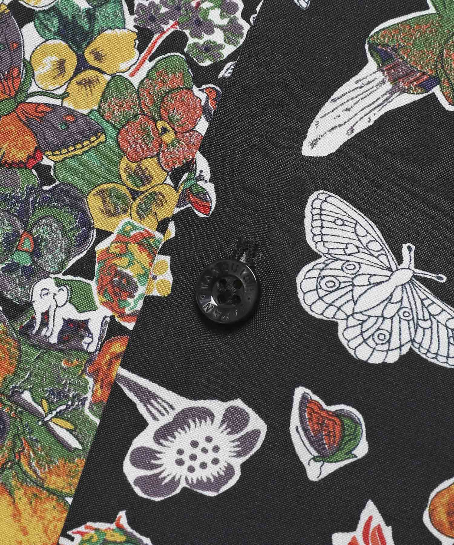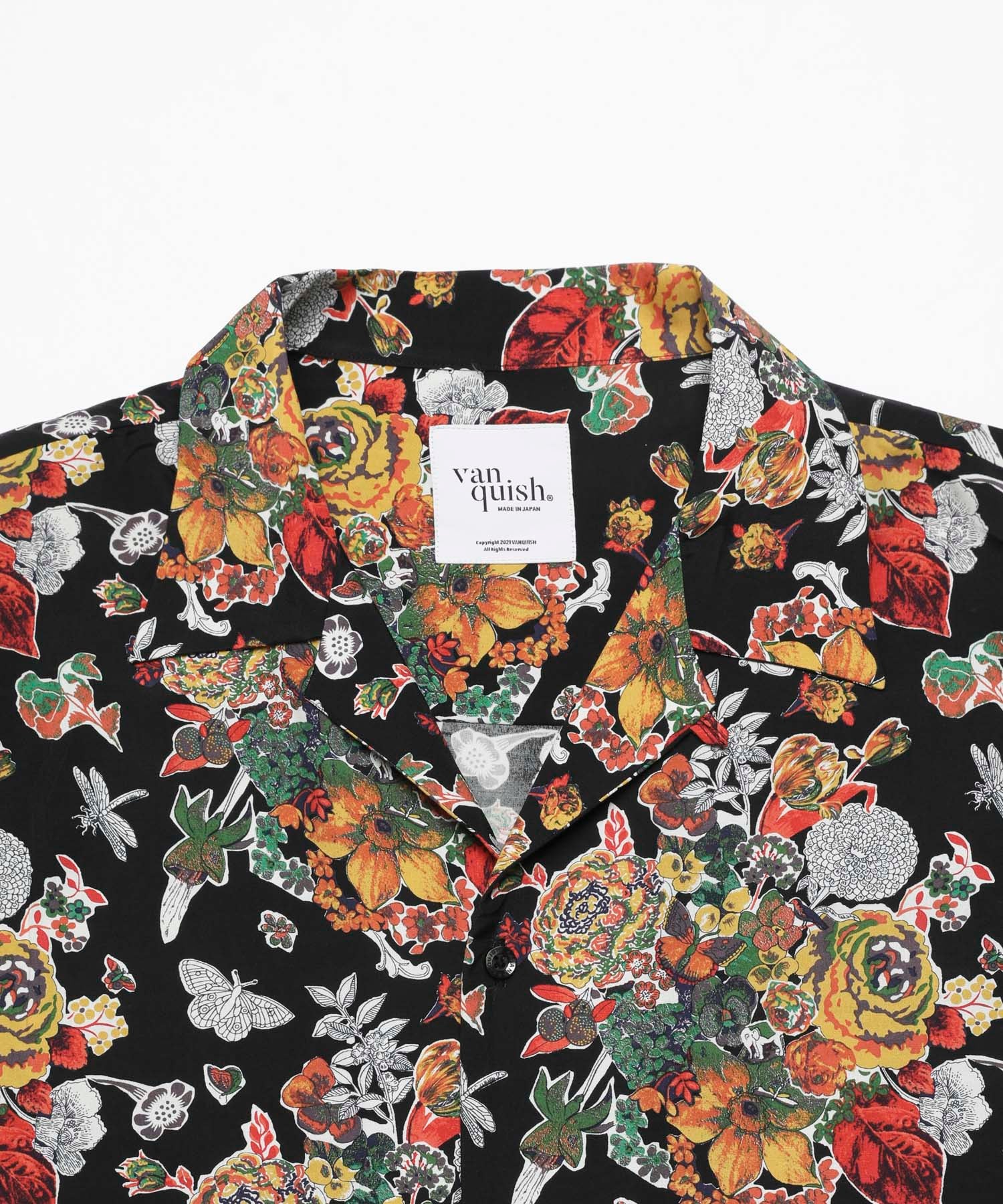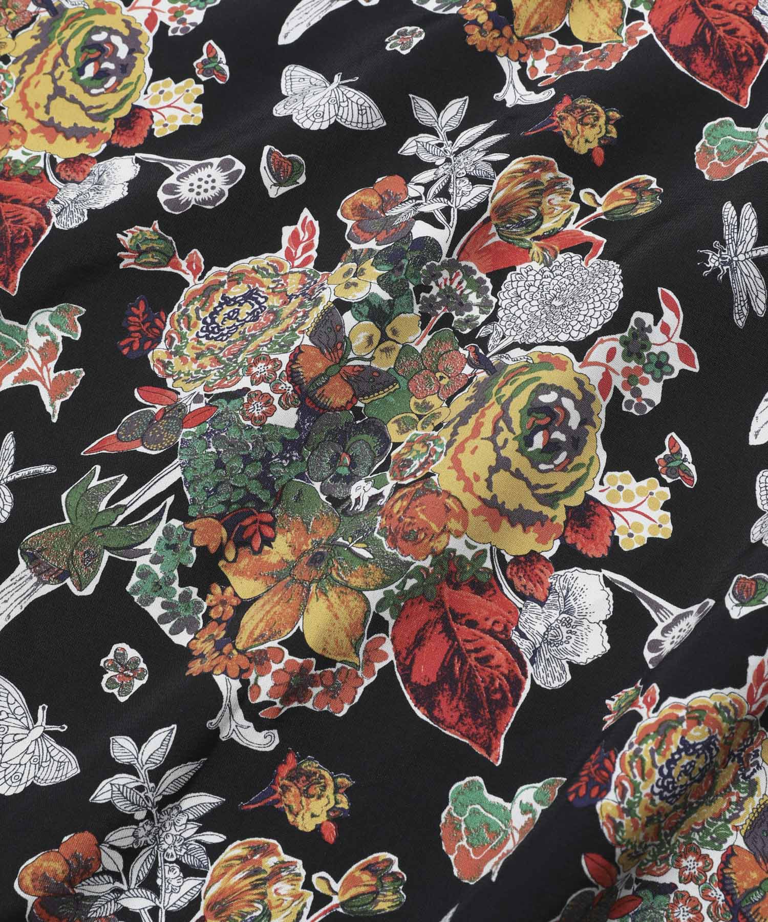 さらっとした肌触りで着心地の良いオープンカラータイプのシャツ。表面に花柄をベースに蝶等を取り入れたデザインをプリントで総柄で落とし込みしっかりとした存在感ながら落ち着きのある仕上がり。
