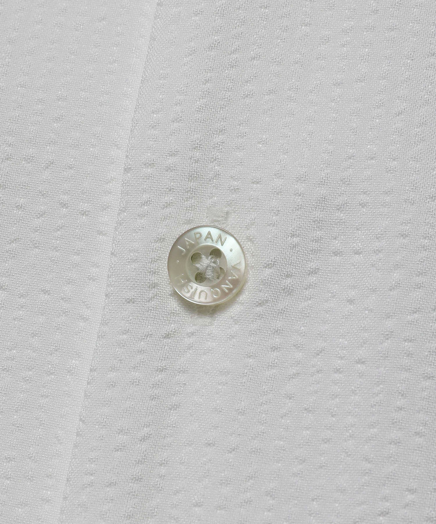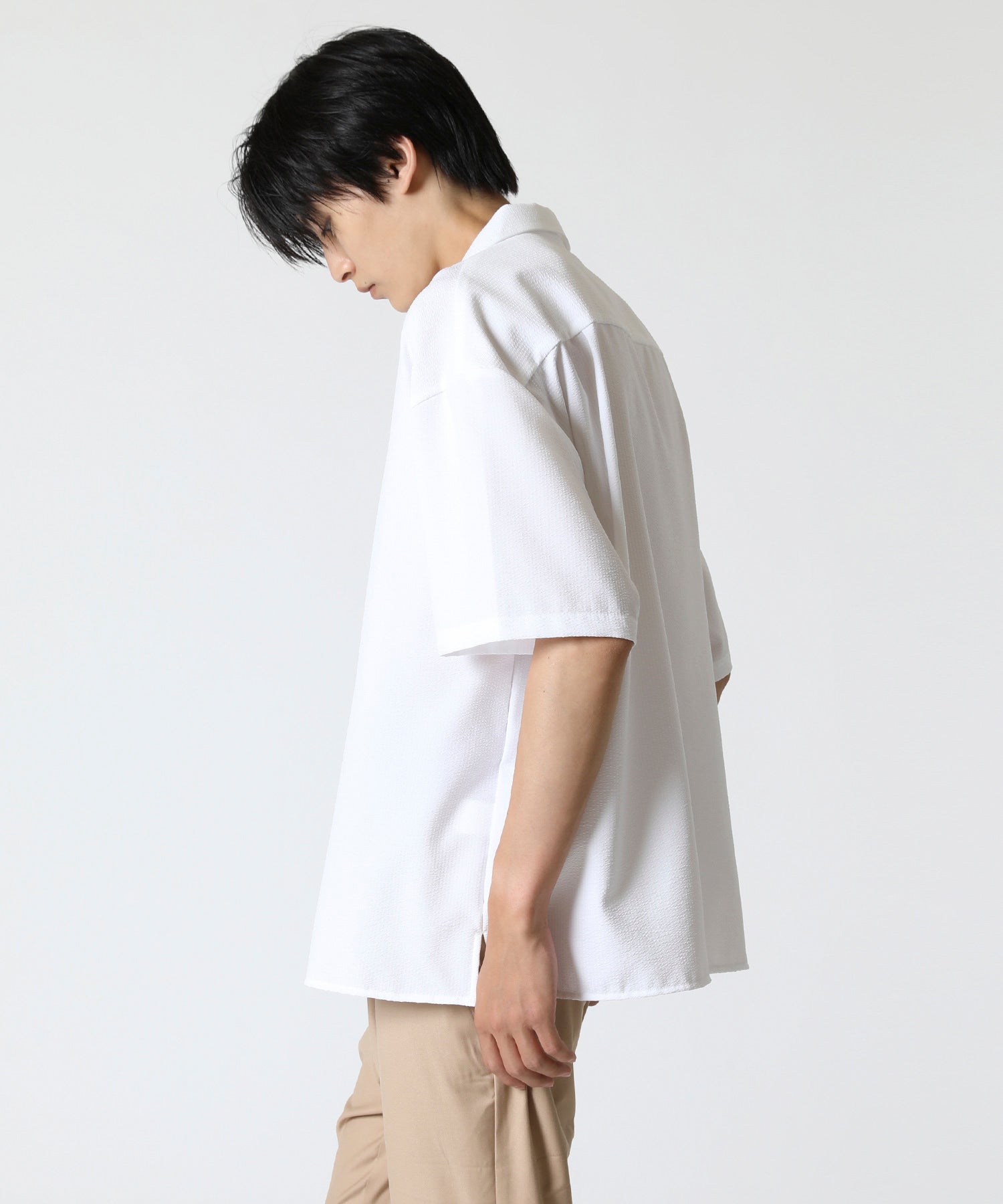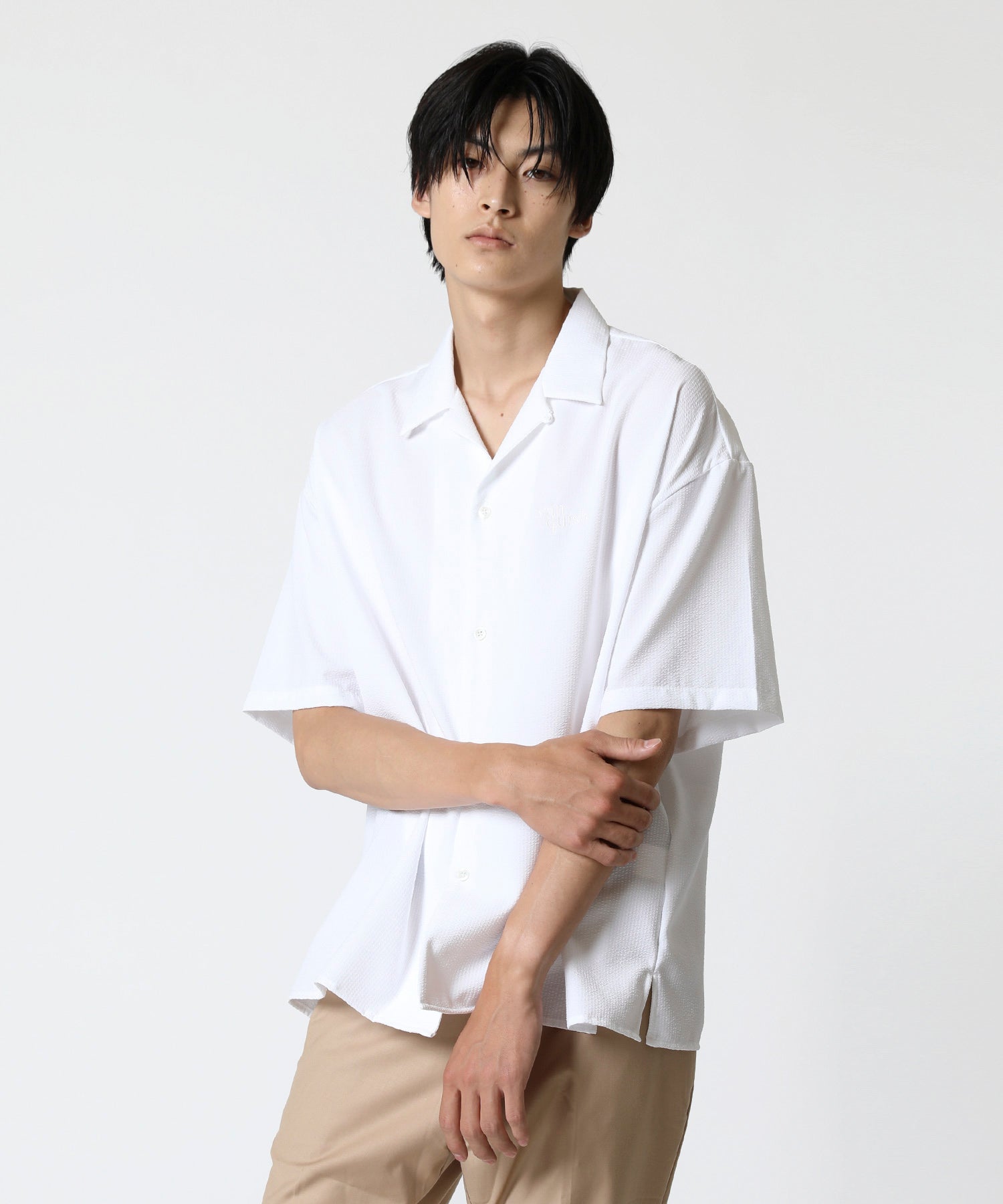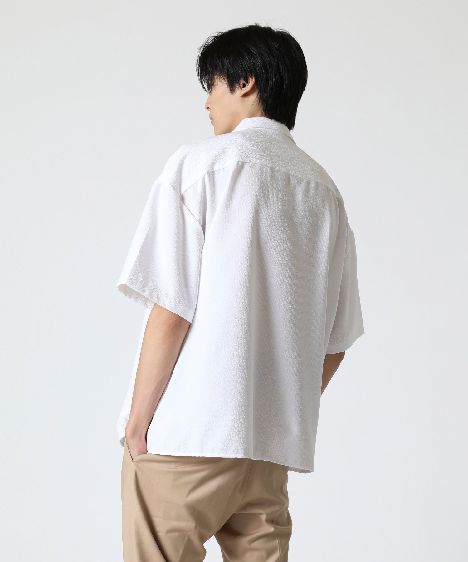 清涼感があり、さらっとした肌触りで着心地の良いシアサッカー生地を使用して作られたシャツ。一見シンプルながら生地特有の凹凸が見た目のアクセントになっているのもポイント。オープンカラータイプなのでコーディネートにも取り入れやすくこの夏活躍出来る一枚です。