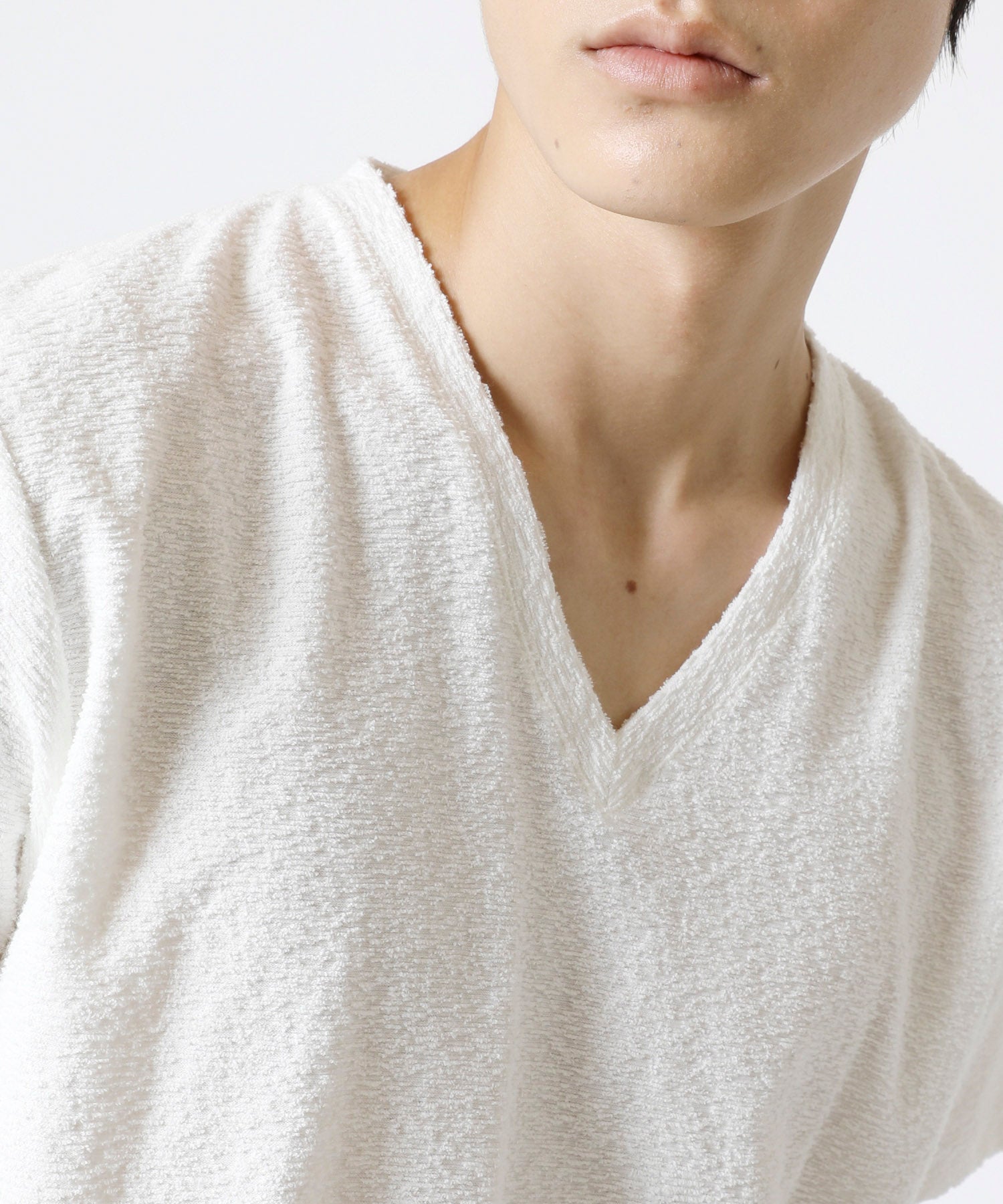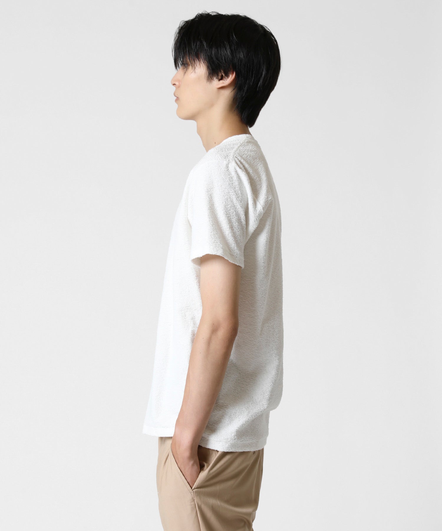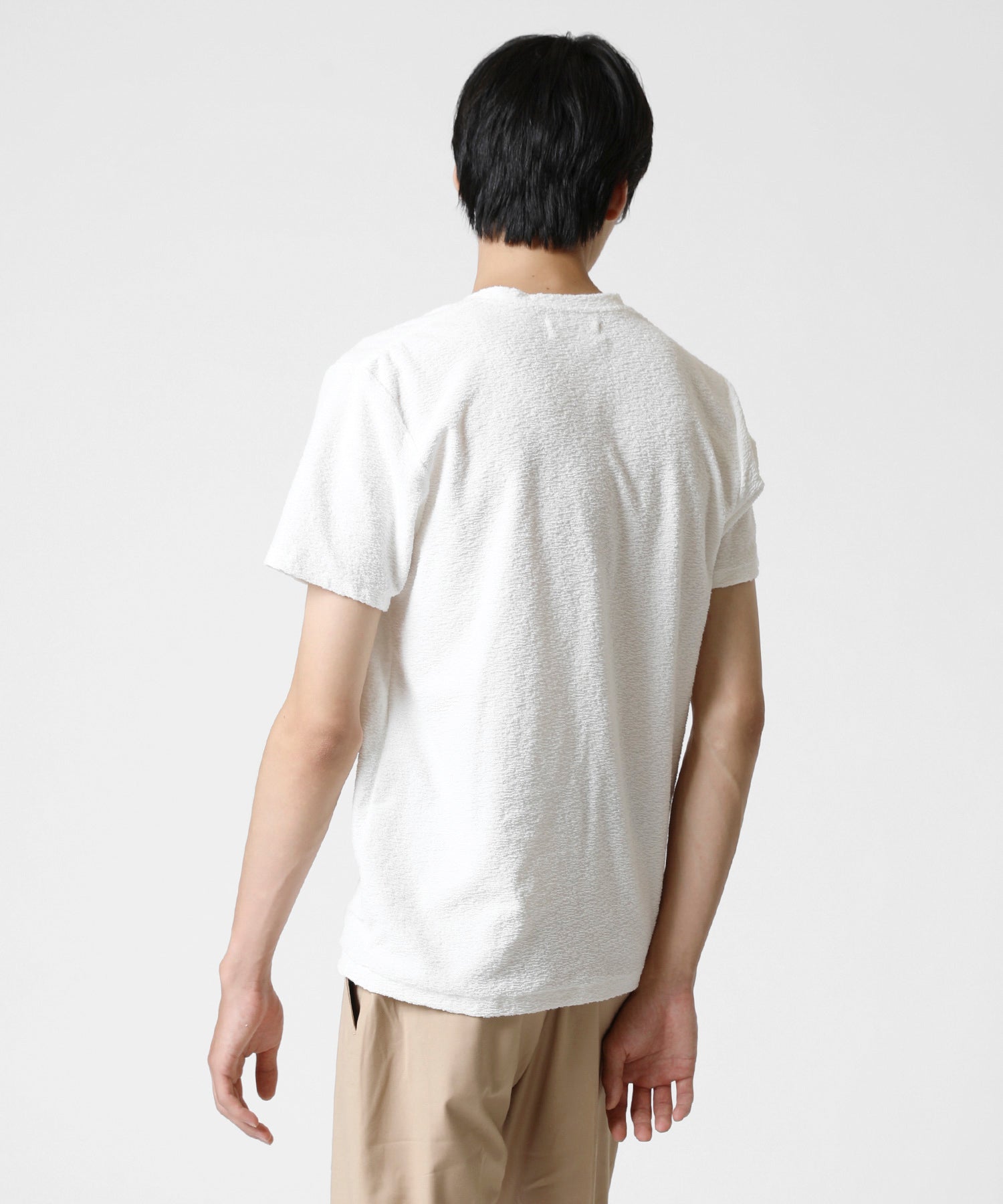 パイル地の素材は長さをランダムに出すことで、表面の凹凸がカジュアルさを生み出しつつ、裏地はサラッとした表面なので、夏の暑い日にぴったりな一枚。