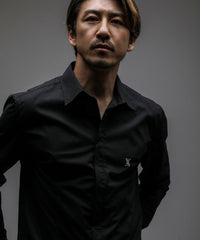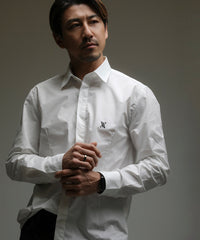 比翼のドレスシャツ。動きやすいストレッチ素材を使用。 様々なタックインを楽しんでいただけるために、着丈を長めにしているのもポイント。 胸にはVAのアイコンを刺繍。 日本国内で生産した「MADE IN JAPAN」製品です。 モデル:H170 着用サイズ:M