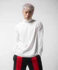 ストレッチ性のある素材を使用したハイネック長袖Tシャツ。