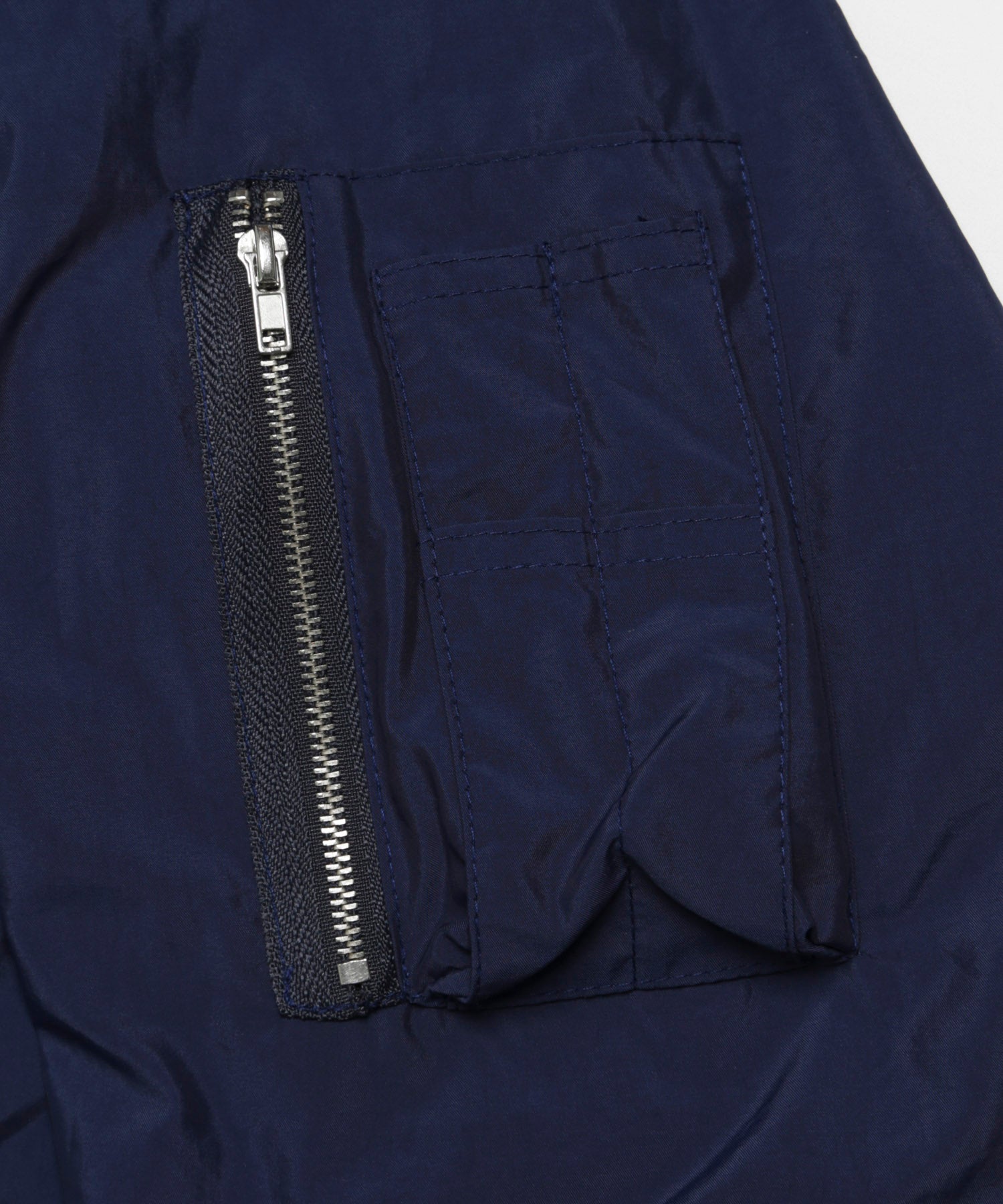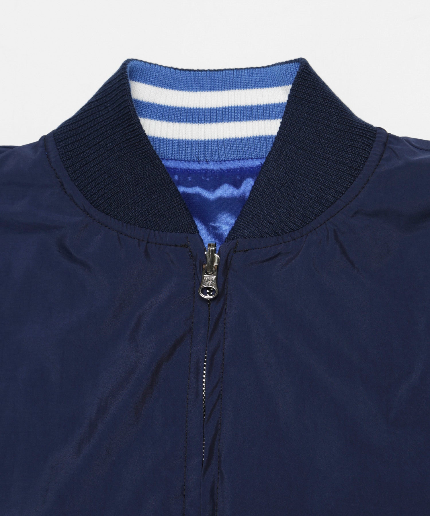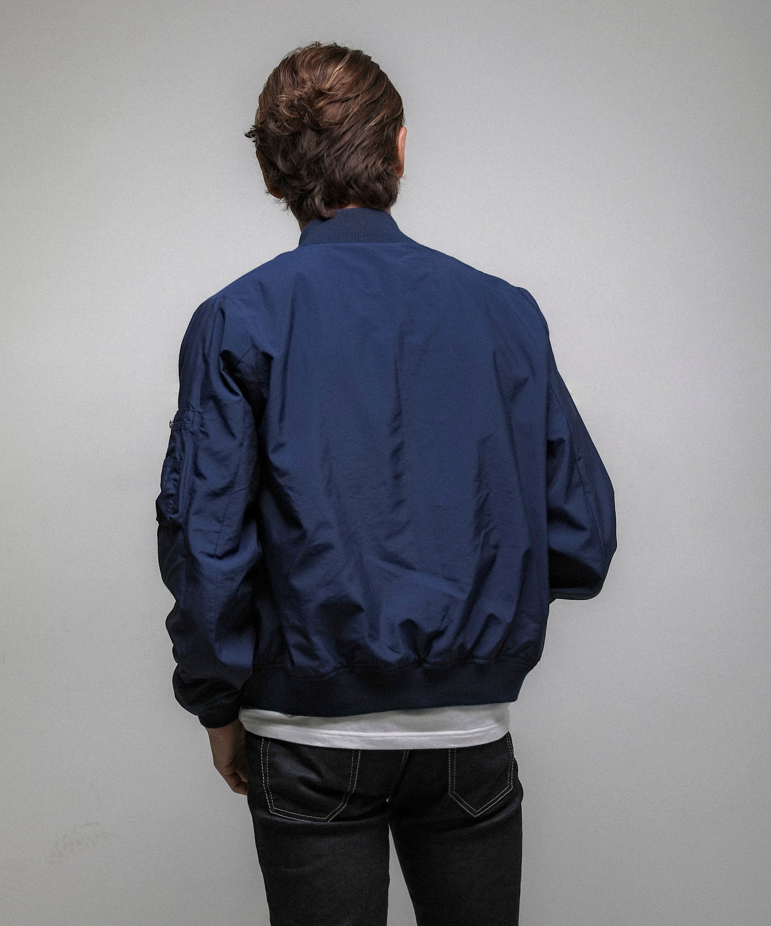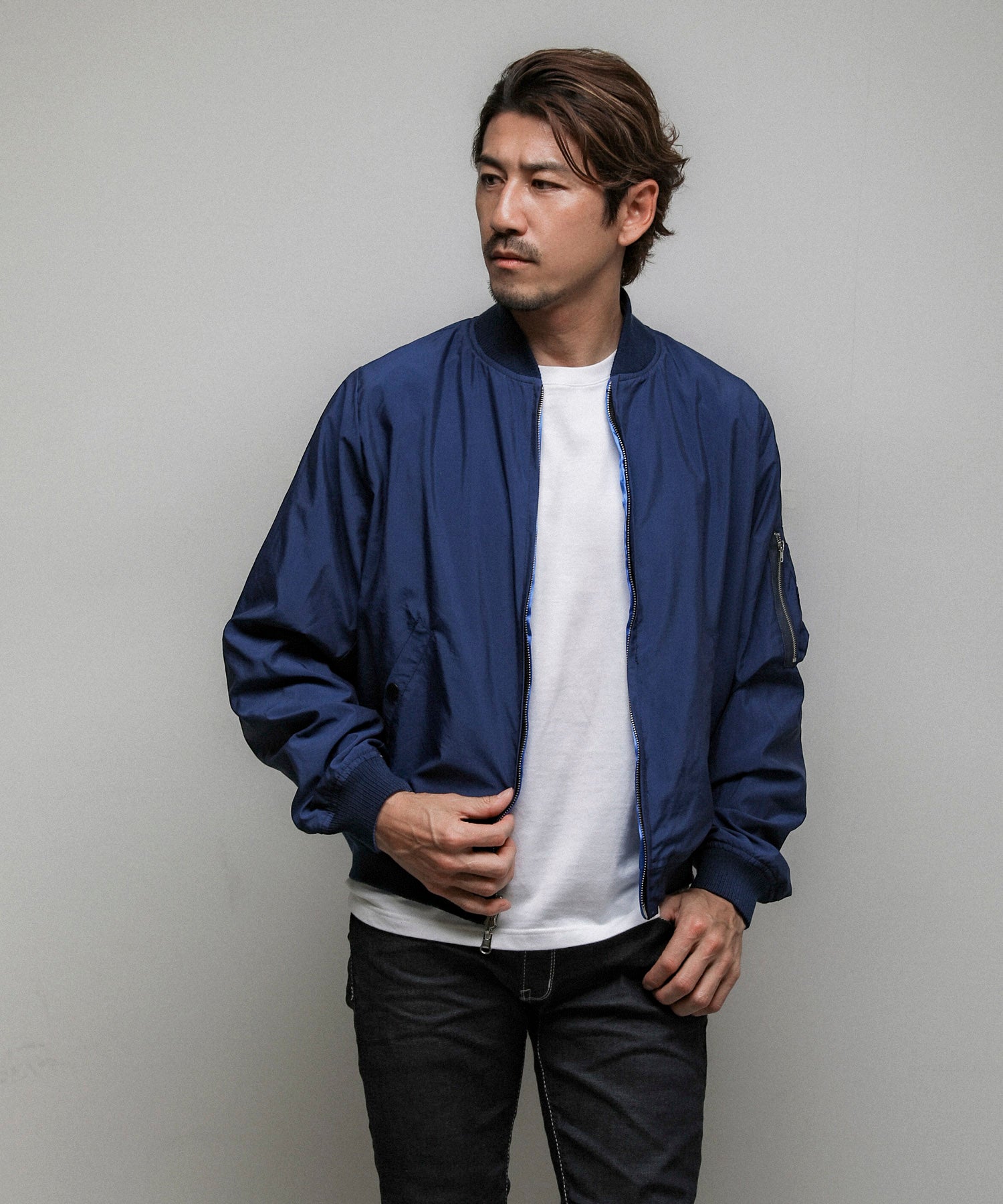 表地は光沢感のある生地を使用し裏の仕様はMA-1のディテールを取り入れたリバーシブルタイプになっていてフロントジップも回転式ジップを使用し裏地はボディカラーに合わせてネイビーブルー、バーガンディ、ブラックをチョイス。