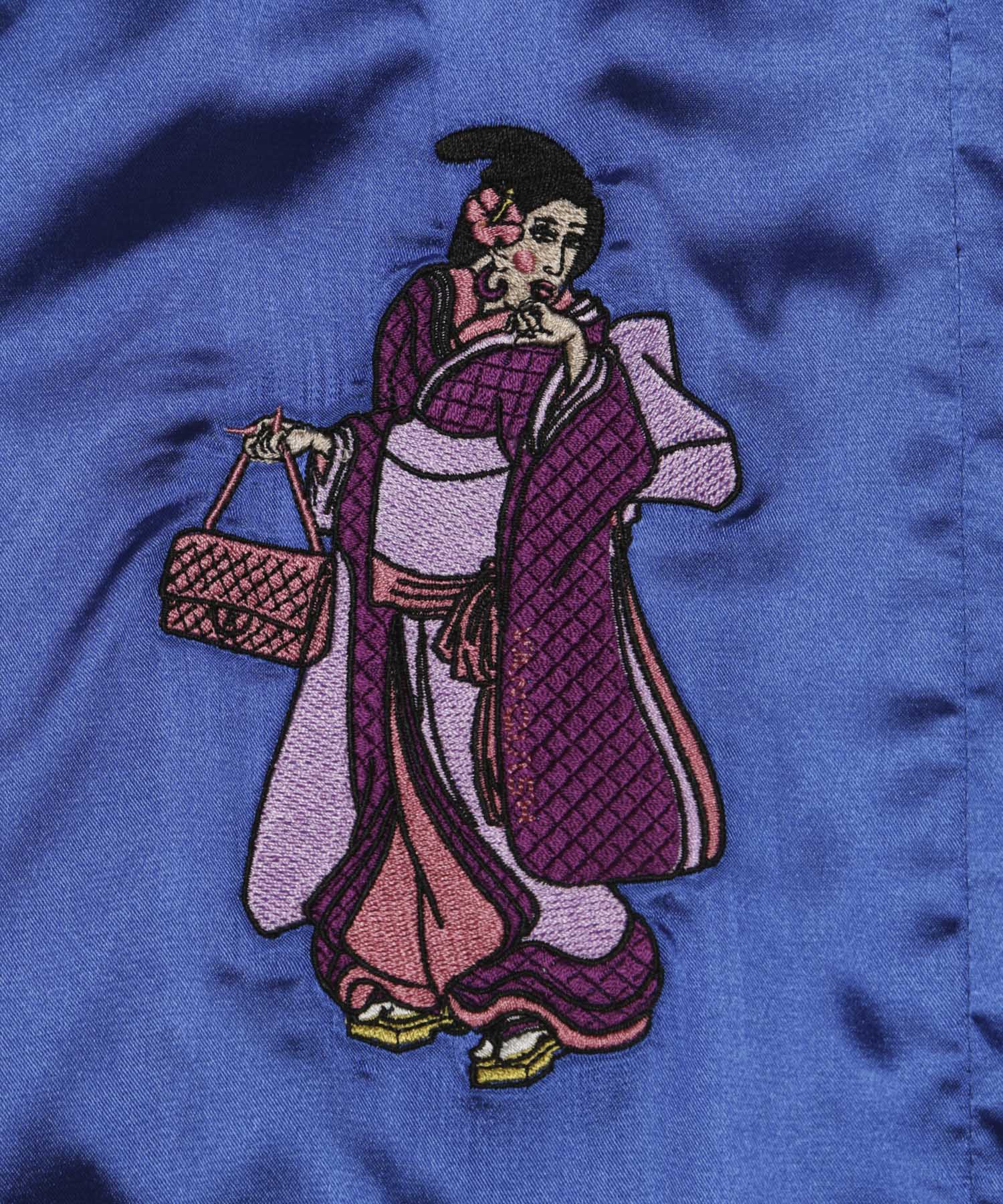 フロント両胸には和装に身を包んだ旅行者を対で刺繍し、 バックには写真撮影する旅行者を刺繍で大胆に表現。