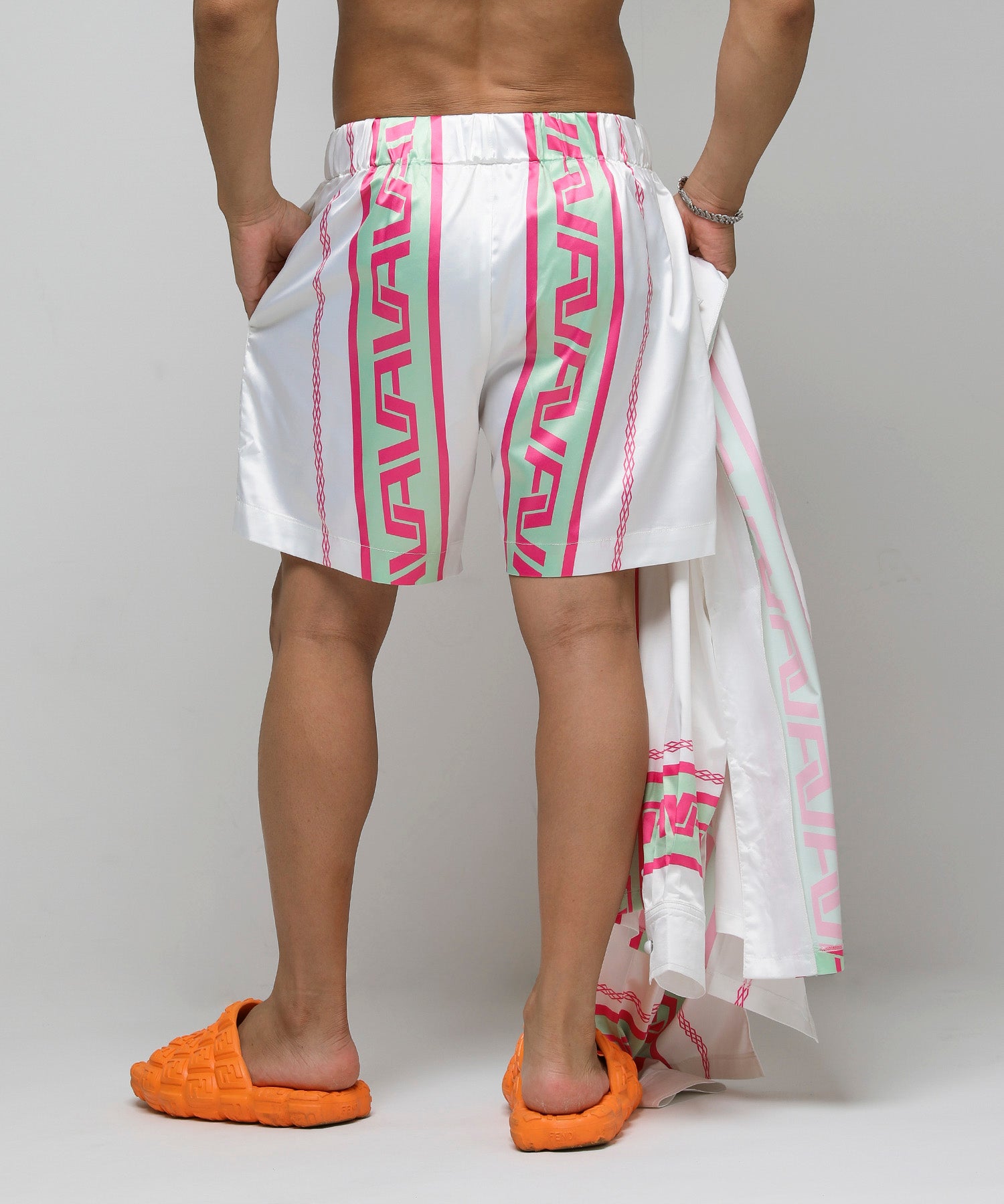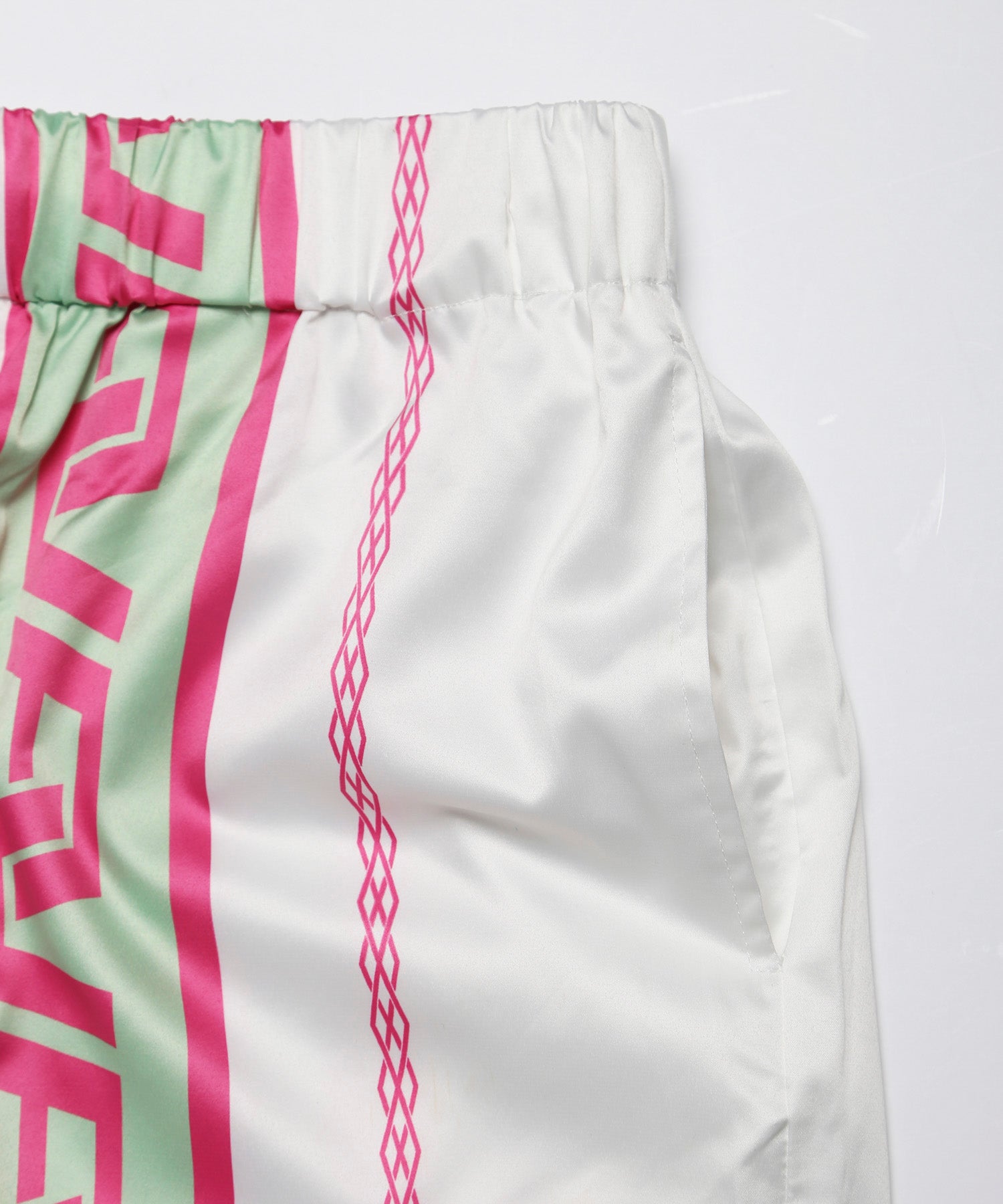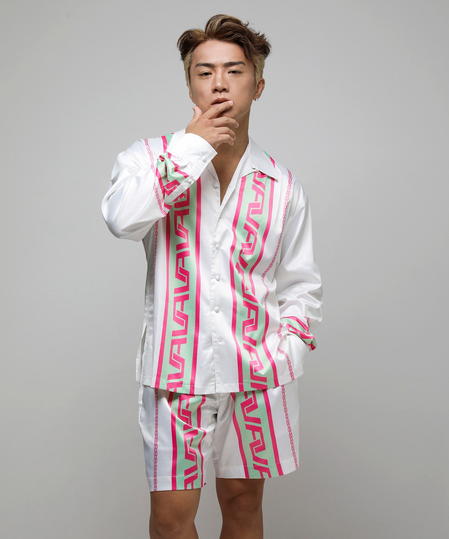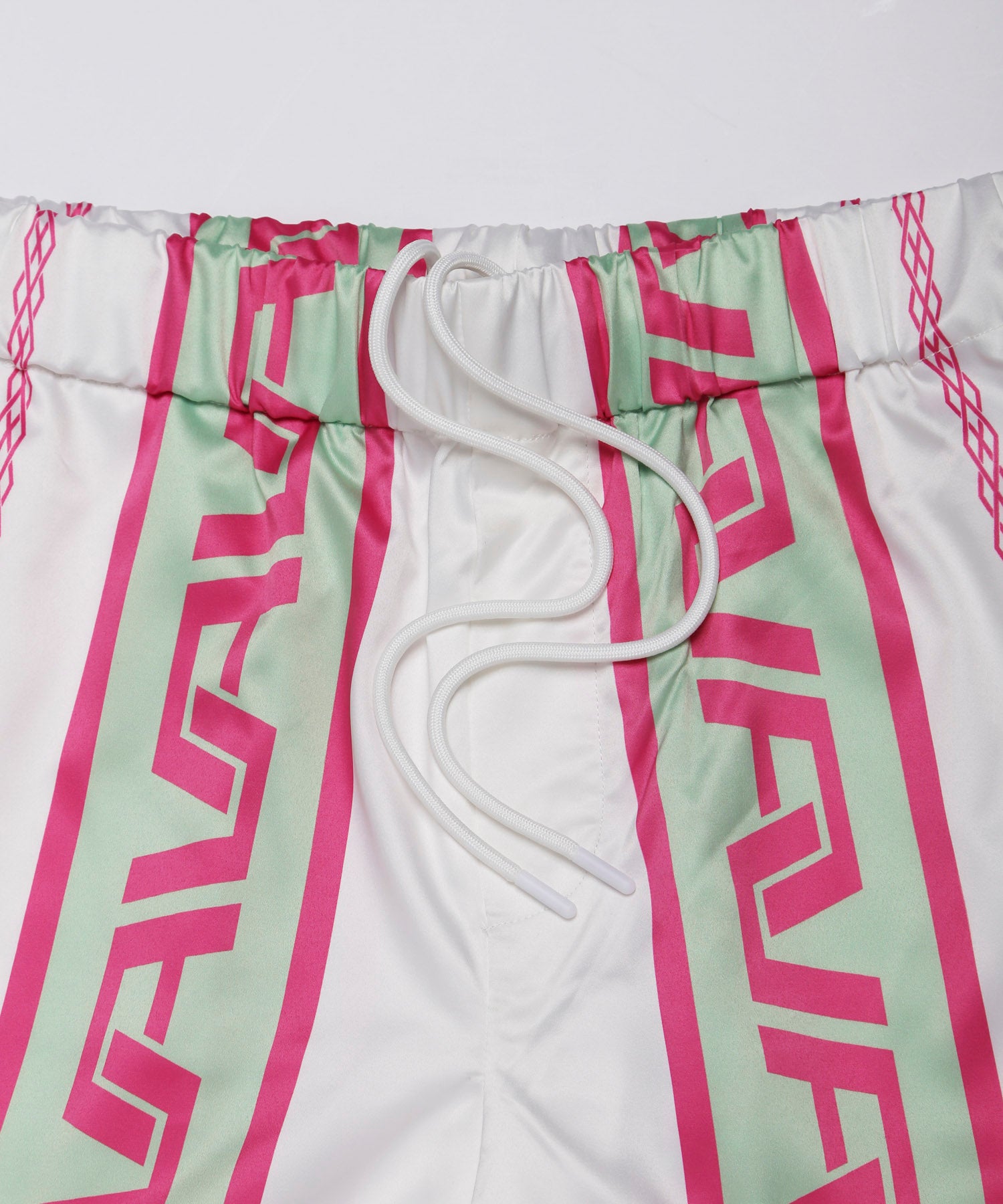 ビビッドなカラーリング柄が施されたこちらのパンツは2色展開。 縦に走る柄はよく見るとVAの文字がデザインされたものになっており遊び心満載。 光沢感のある素材は着心地がよく、オン・オフ問わず ルームウェア・ナイトウェアとしてもお使いいただけます。 VYS008とセットアップで着用いただけます。