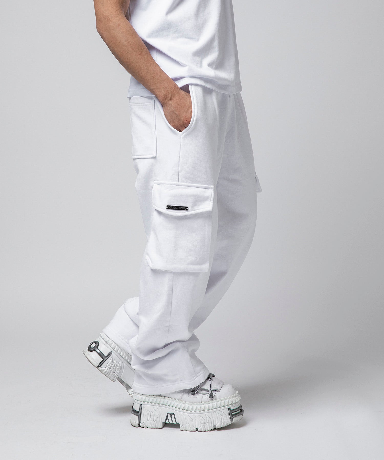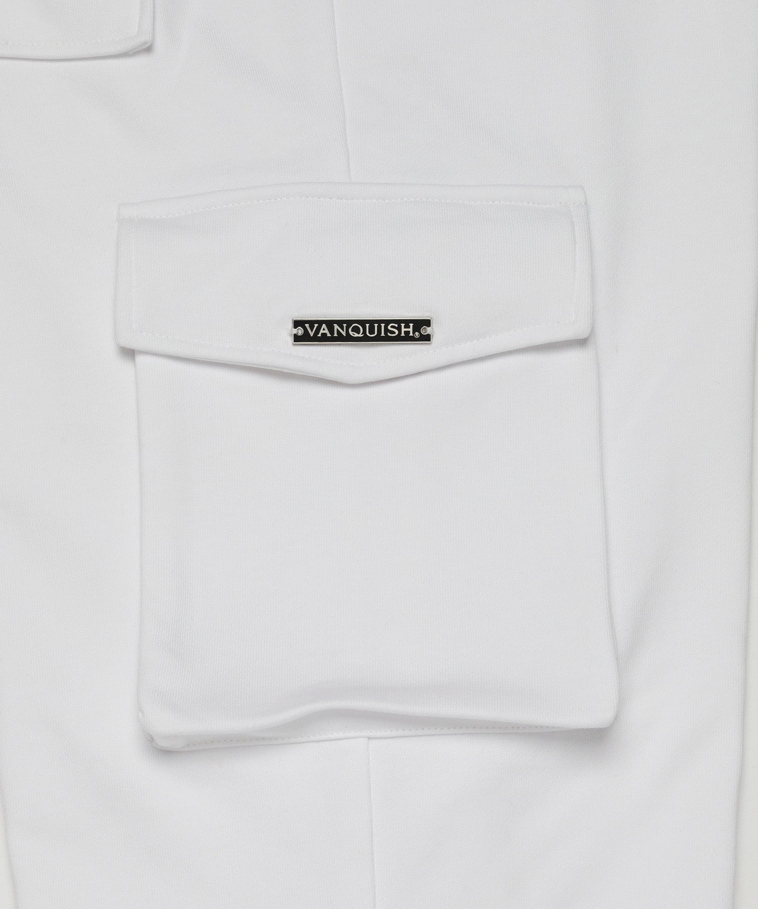 大容量サイドポケット付きで実用性も抜群。右側サイドポケットには“VANQUISH”メタルプレートを配置。左ヒザ下にはボディーカラーと同色で“VANQUISH”ロゴをプリント。