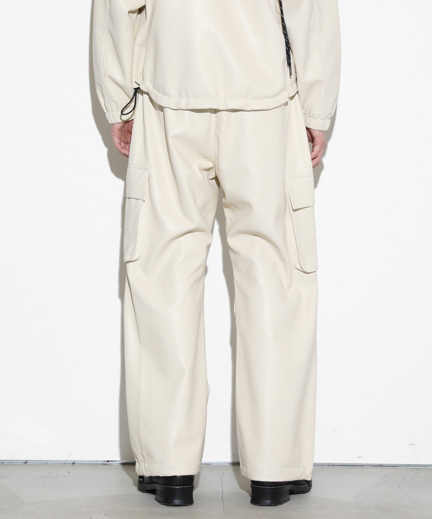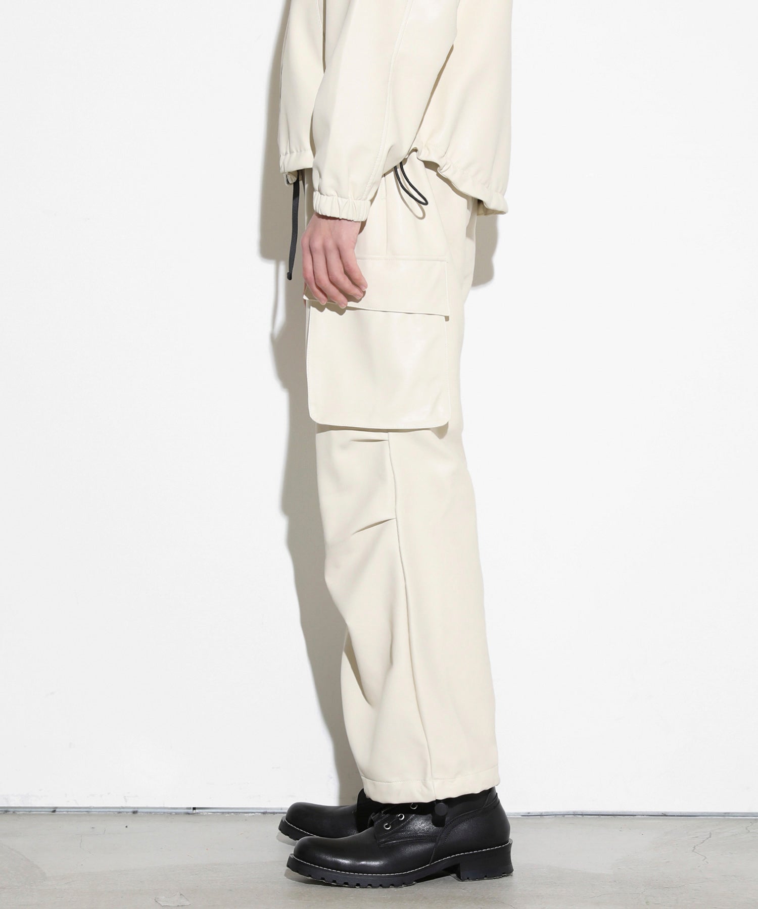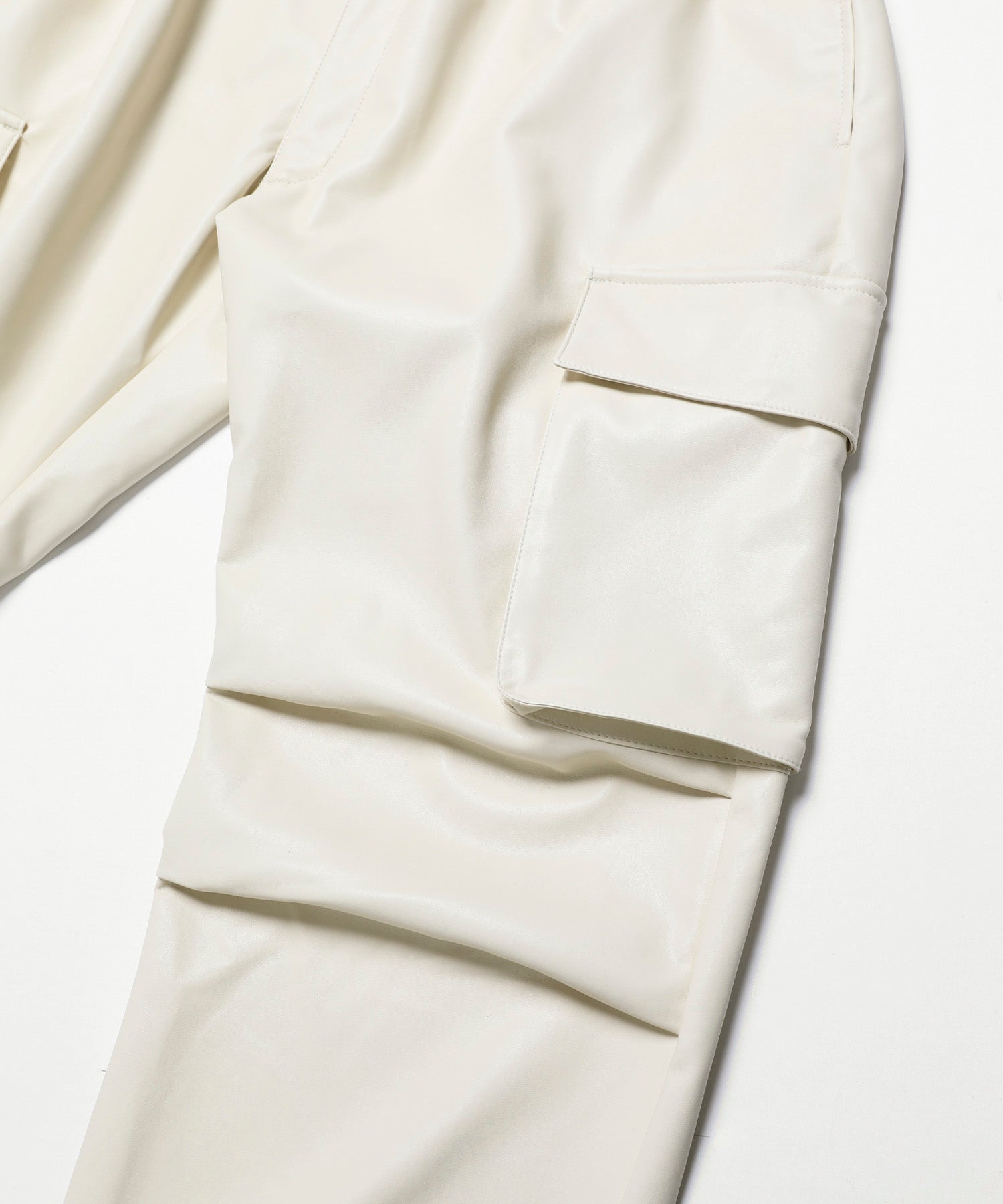 本革のような風合いを持った合皮生地をベースにしたカーゴパンツ。