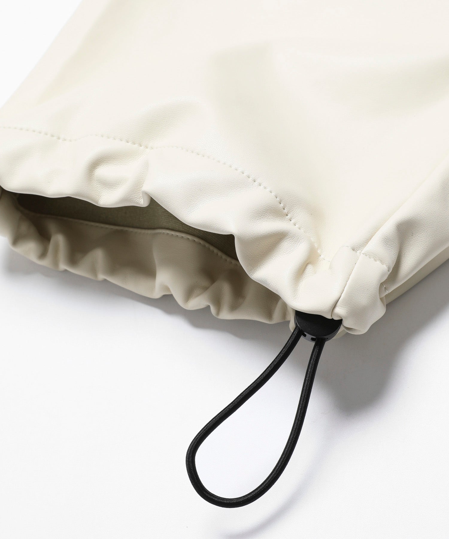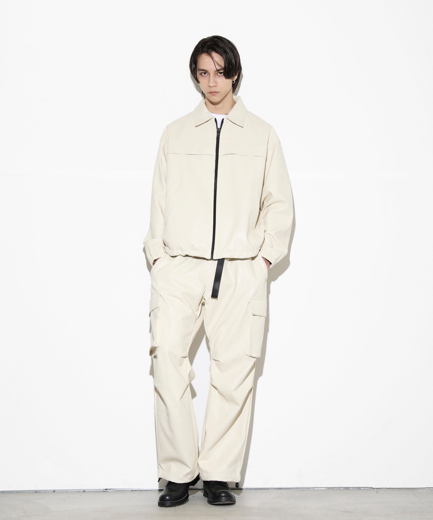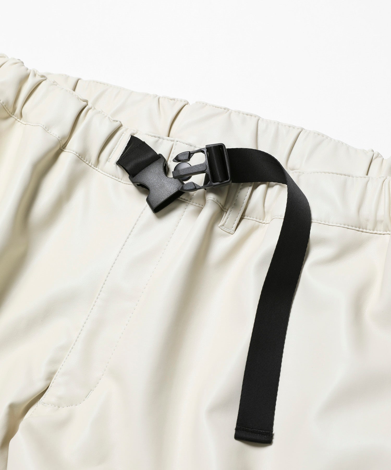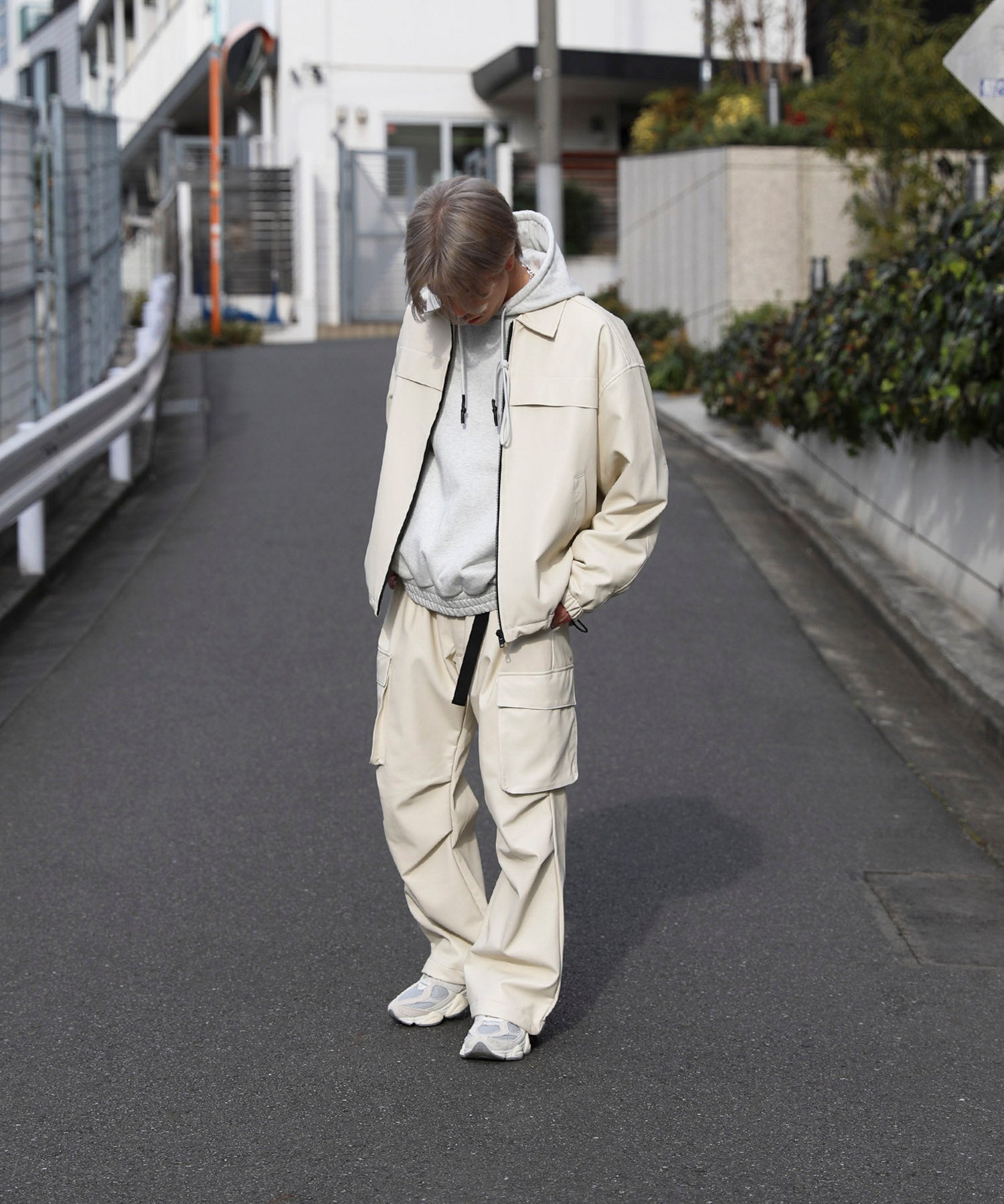 本革のような風合いを持った合皮生地をベースにしたカーゴパンツ。