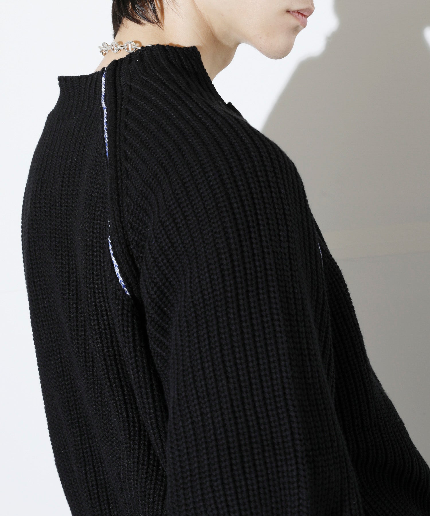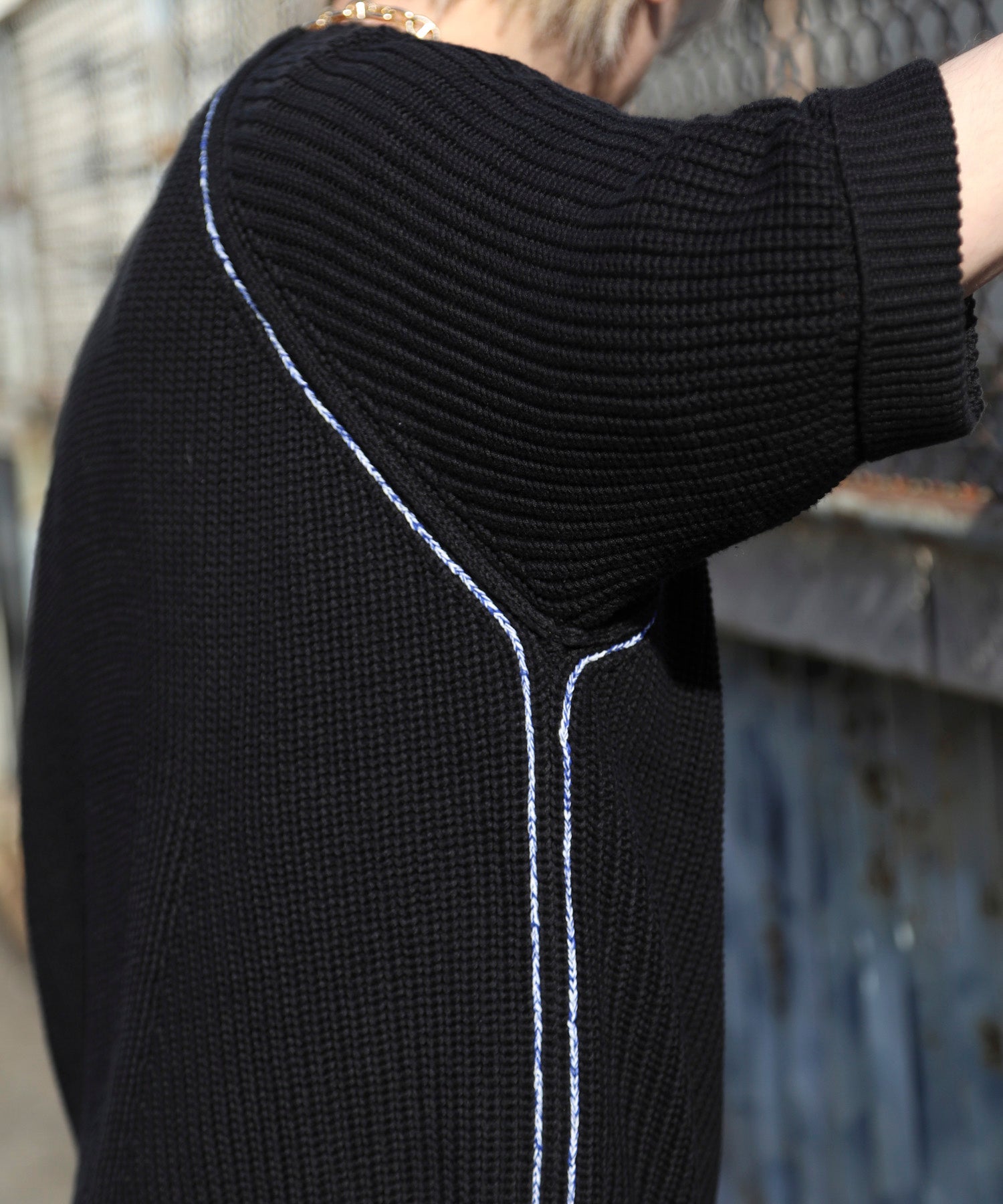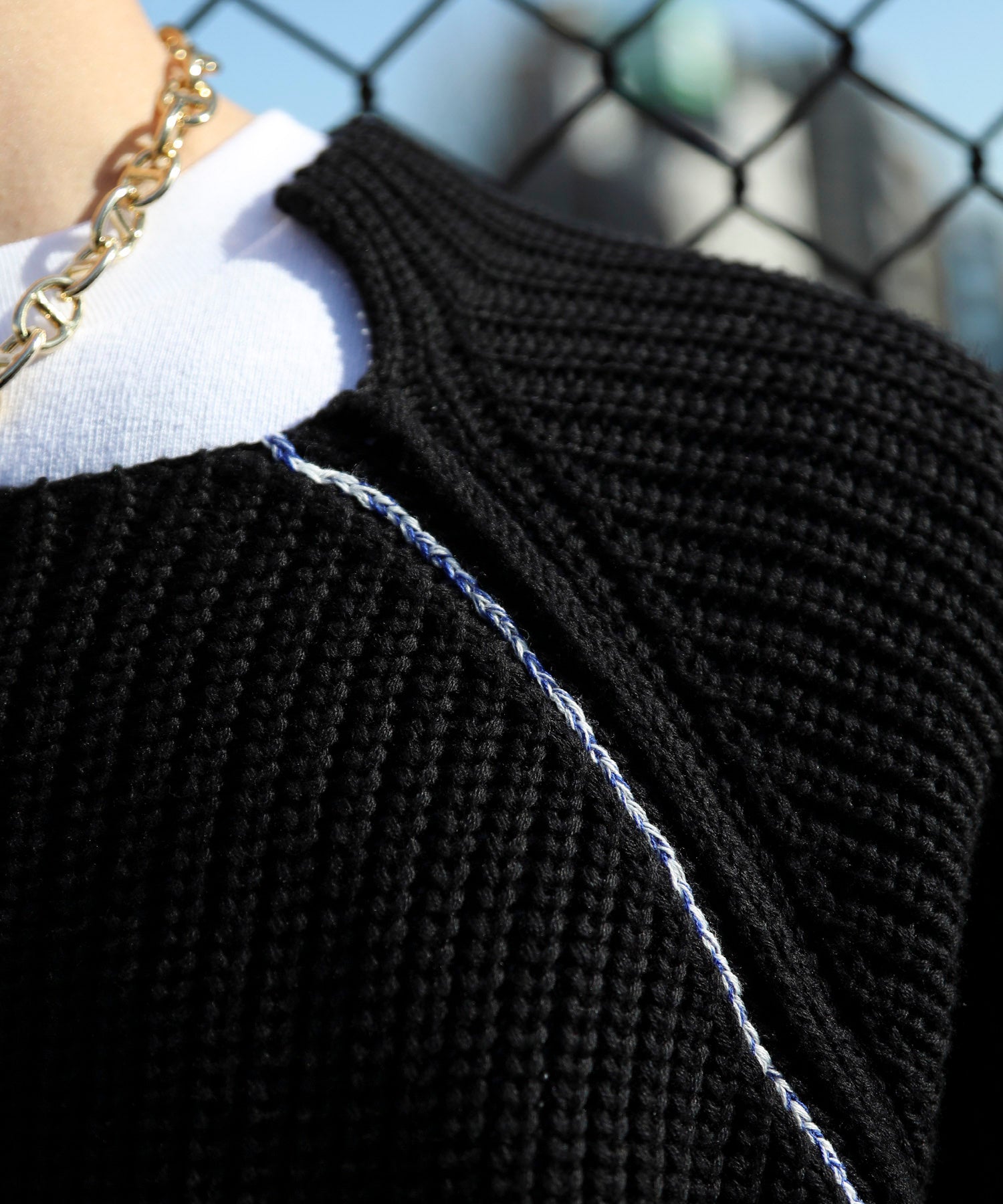 脇線から裾にかけてニットにかがり込んだブルー×ホワイトのチェーンステッチミックス糸のコントラストがコーディネートのアクセントに。