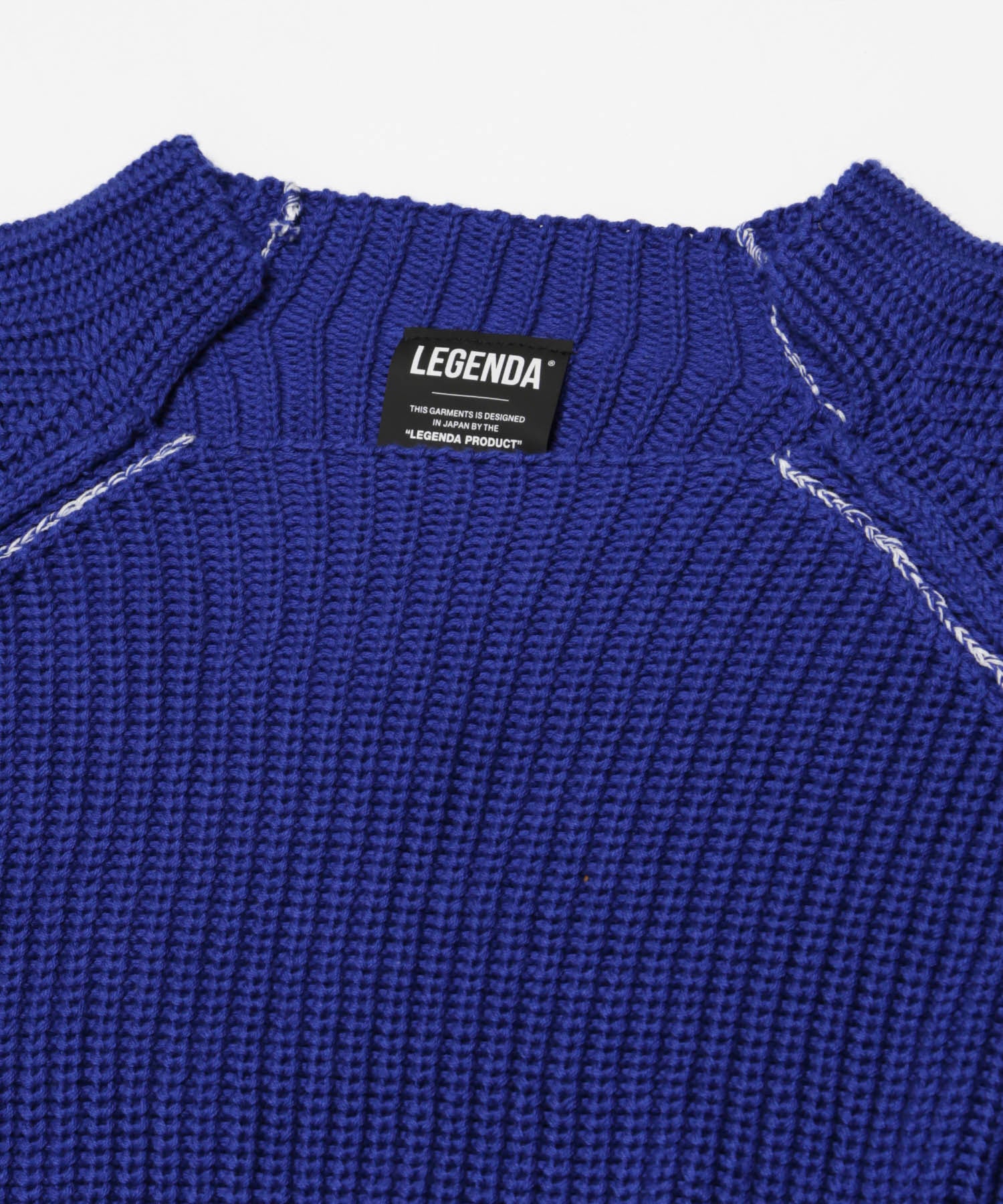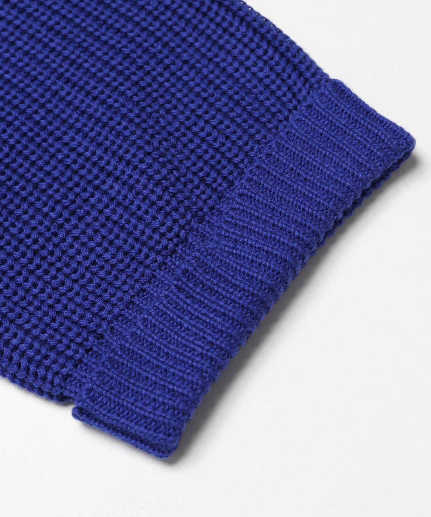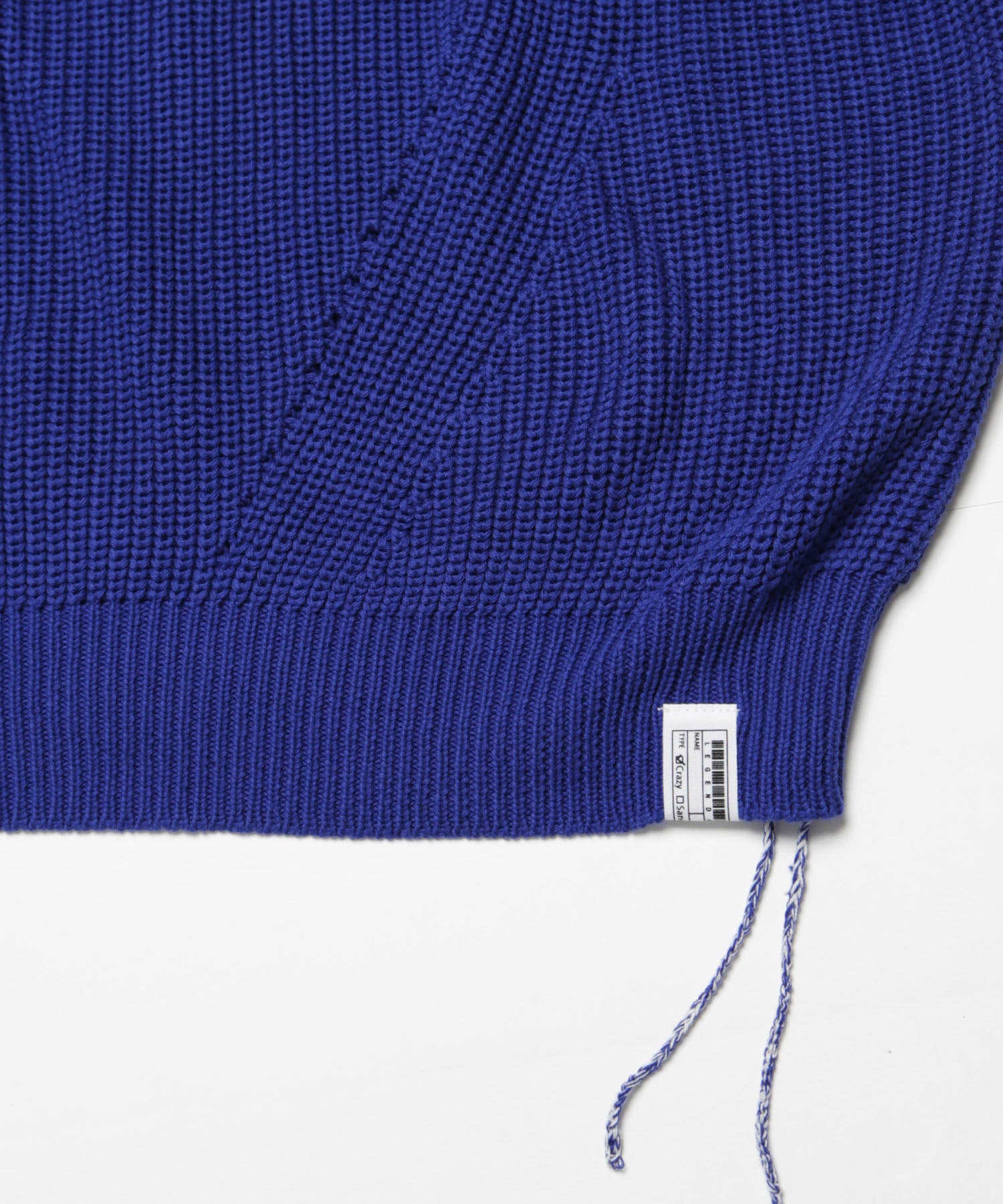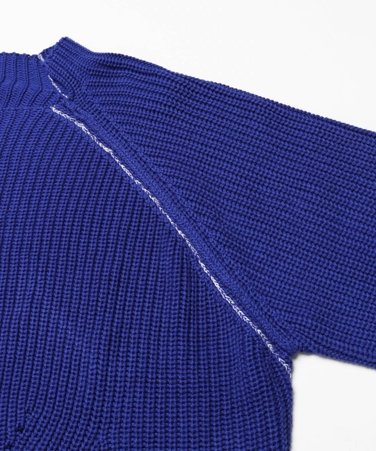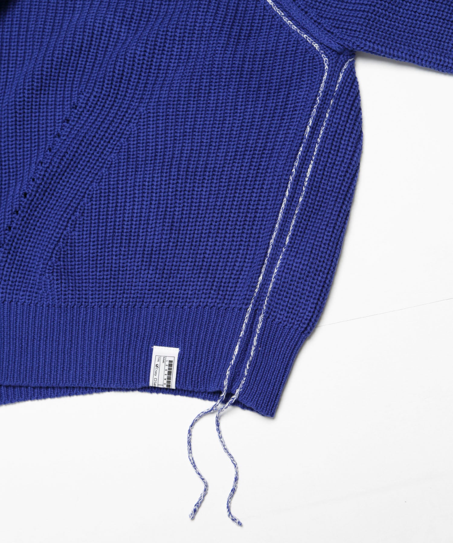 脇線から裾にかけてニットにかがり込んだブルー×ホワイトのチェーンステッチミックス糸のコントラストがコーディネートのアクセントに。