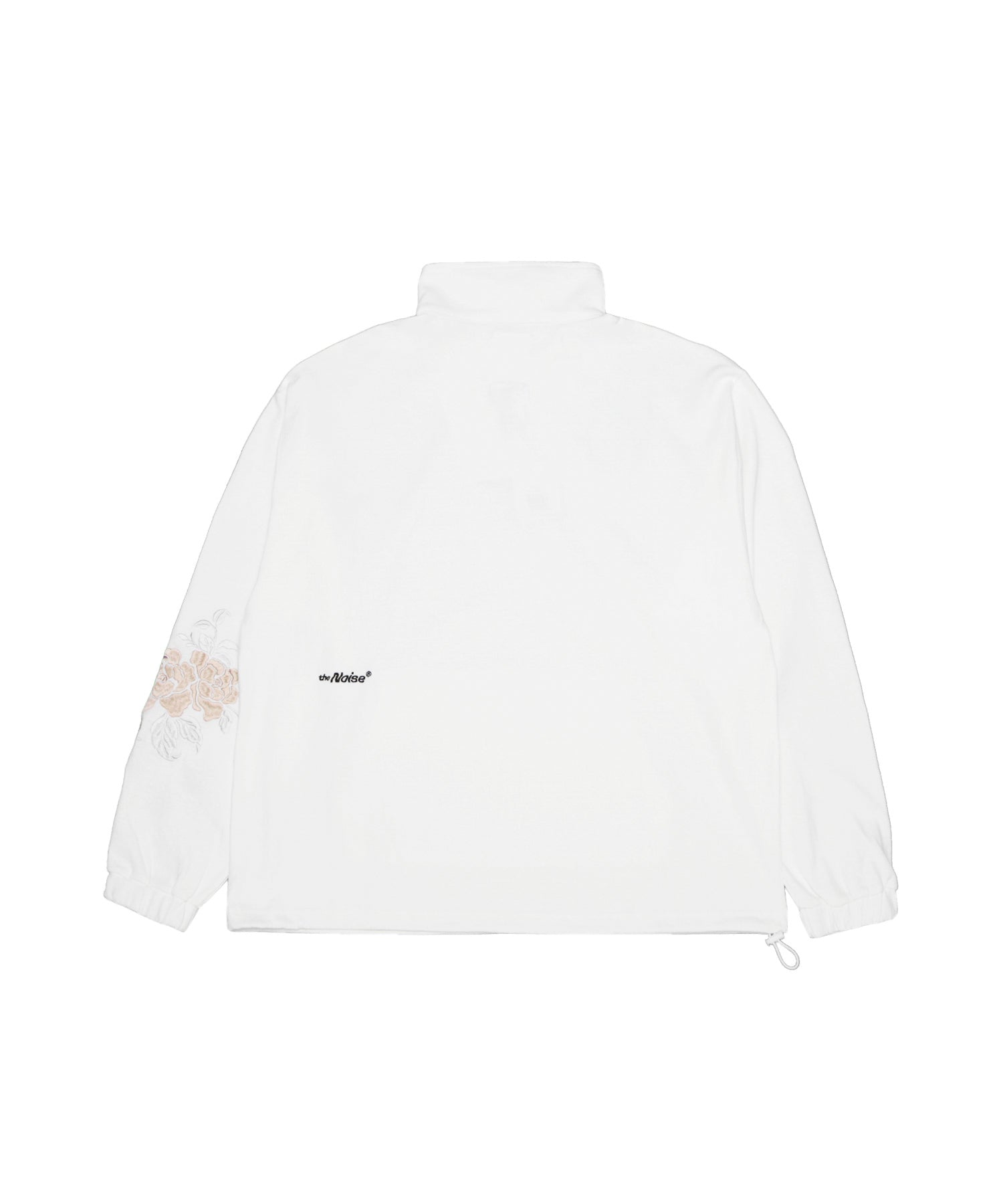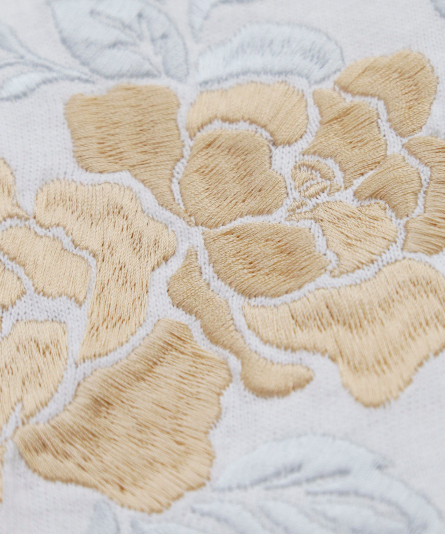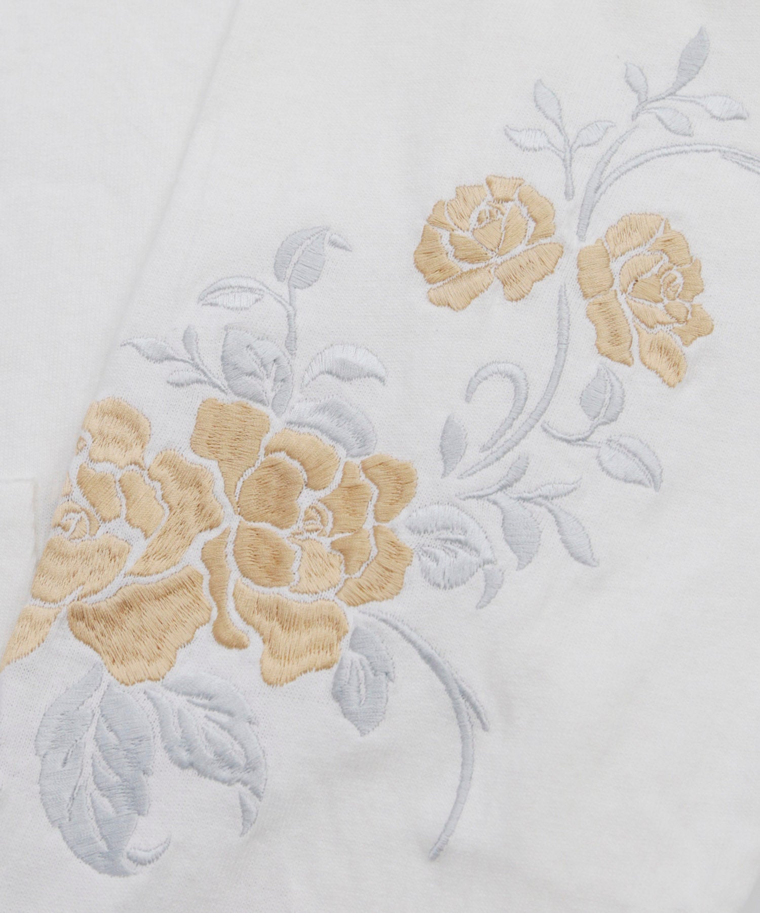 袖元にバラの刺繍を入れたハーフジップロングスリーブTシャツ。