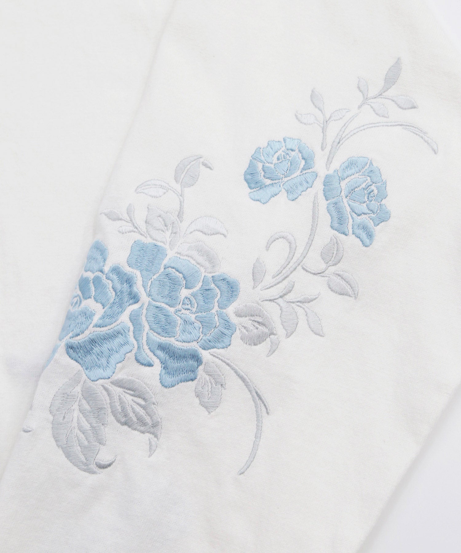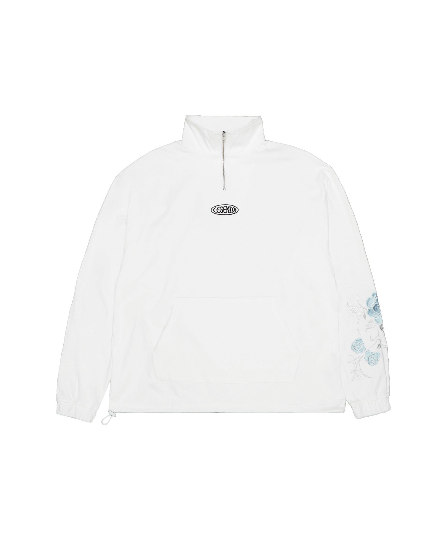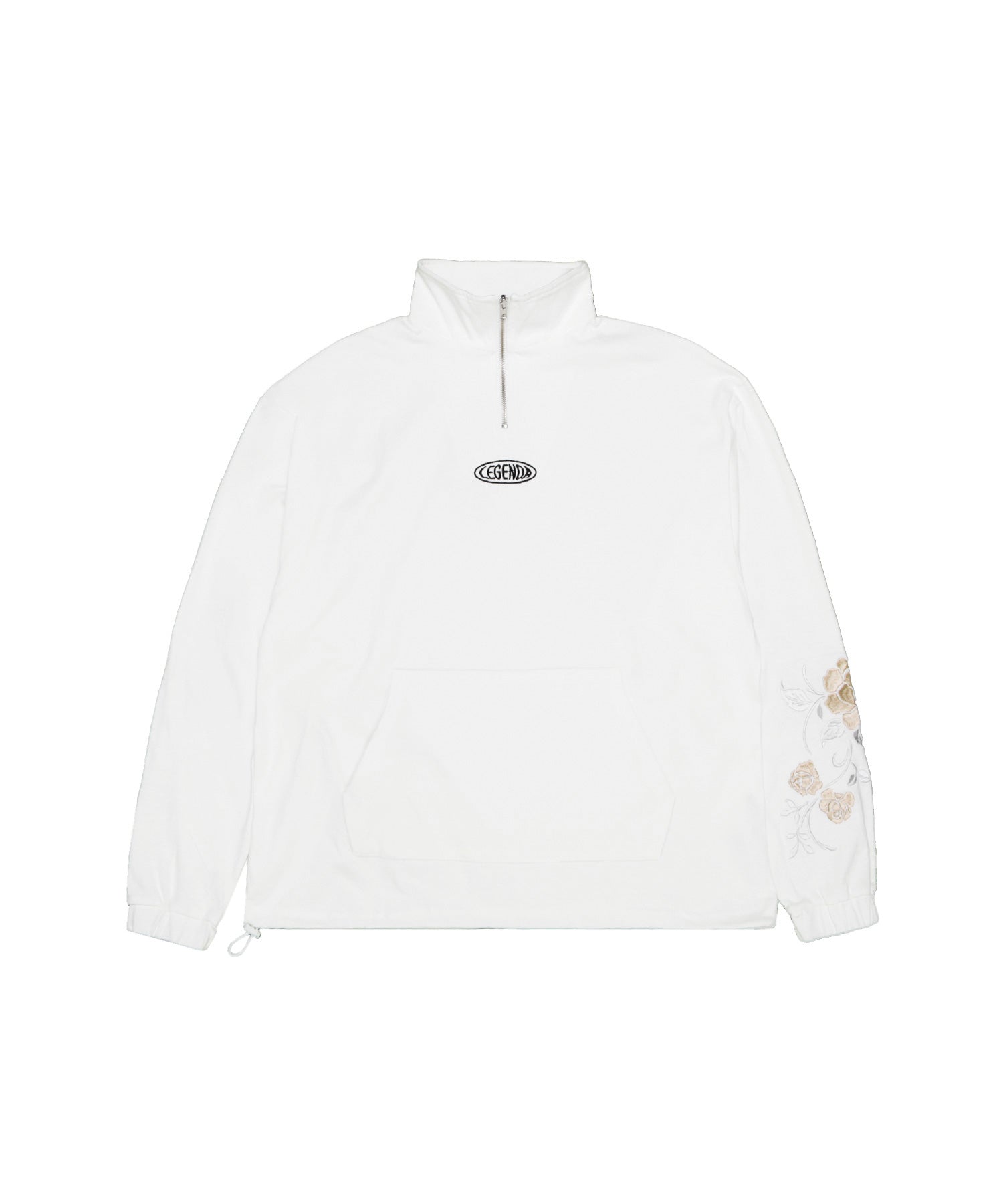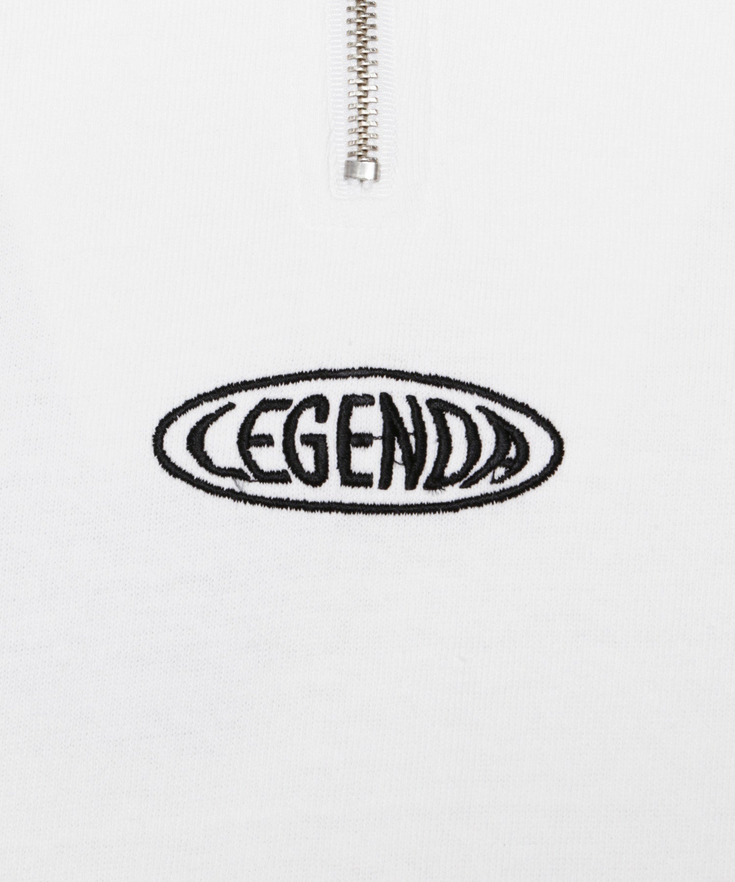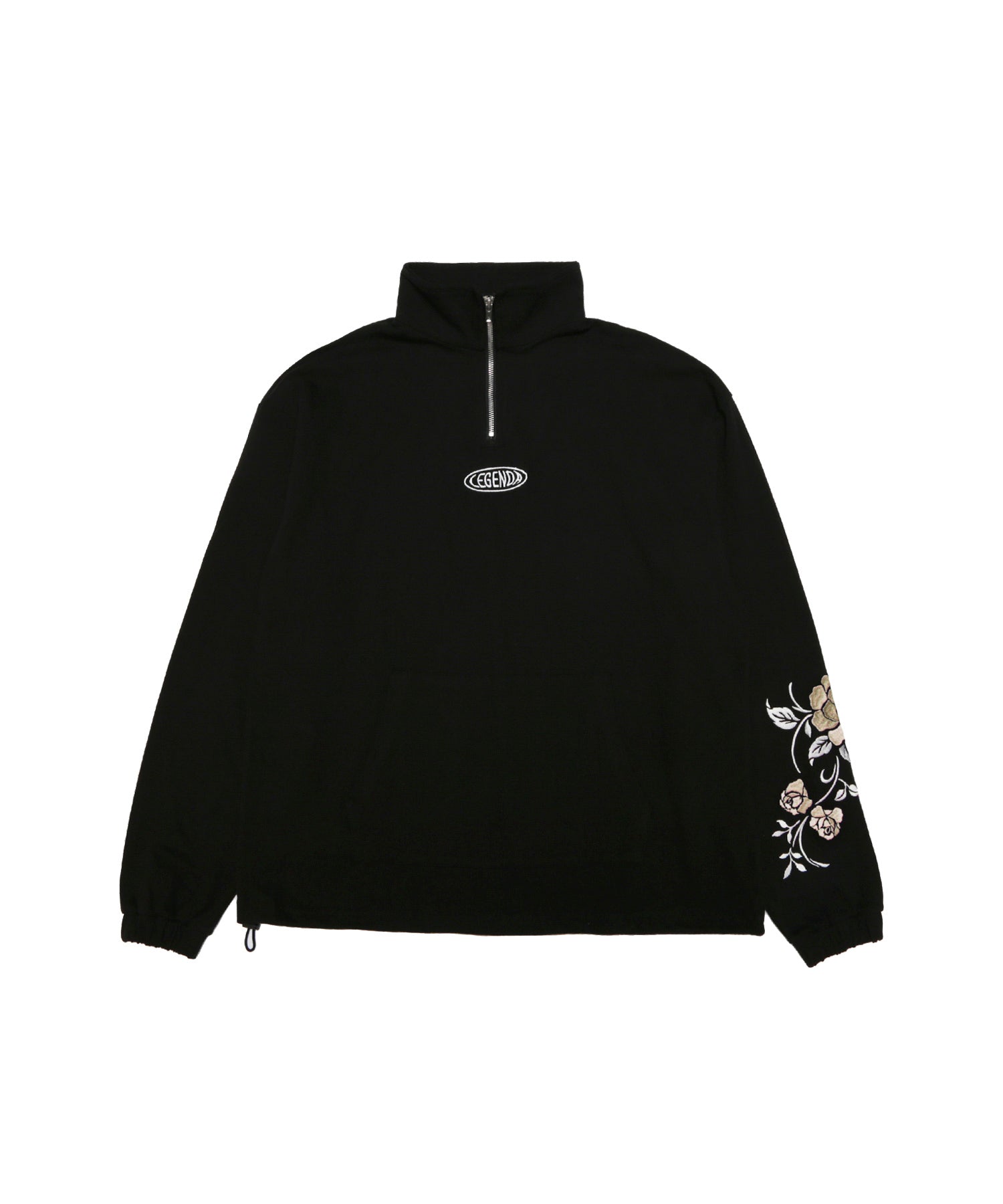 LEGENDA12周年記念アイテム。 袖元にバラの刺繍を入れたハーフジップロングスリーブTシャツ。 袖元や裾はリブで絞りをつけることでシルエットに丸みを持たせつつも全体的に統一感がありまとまりのある一枚。 しっかりとした天竺生地で着心地の良い仕上がりになっています。 ユニセックスで着用いただけます。