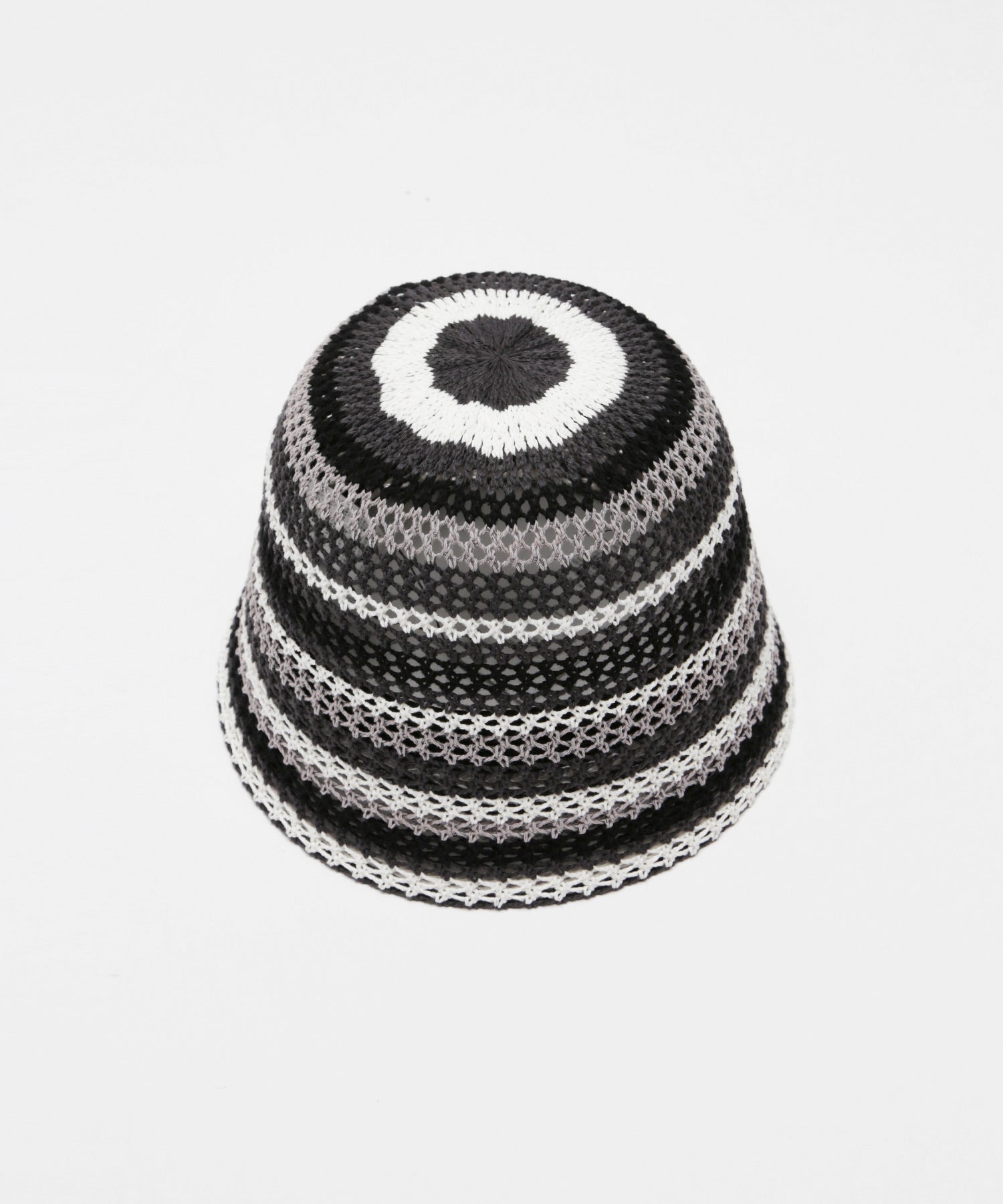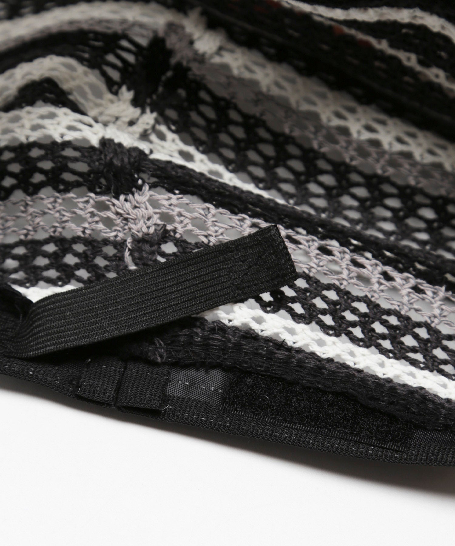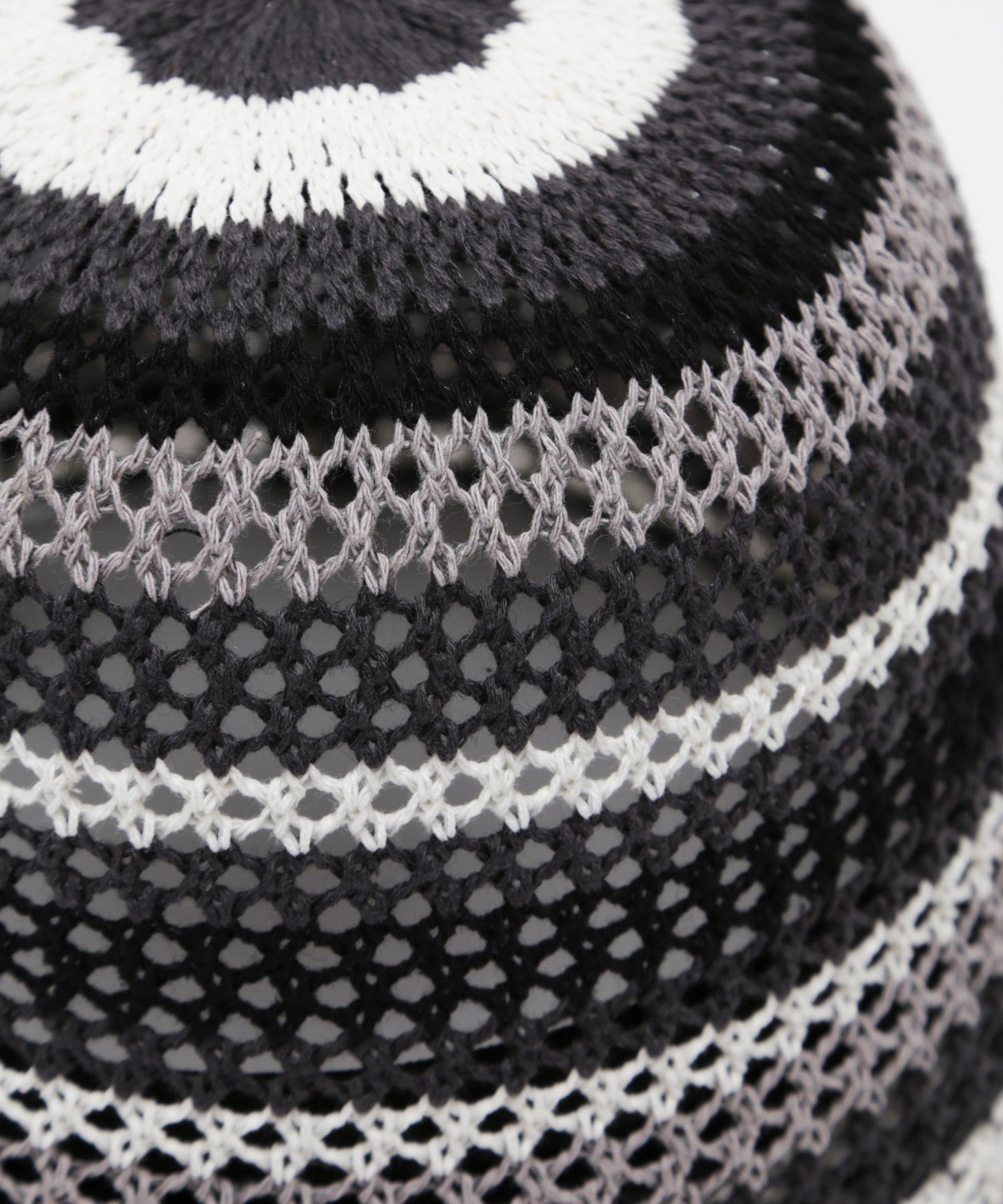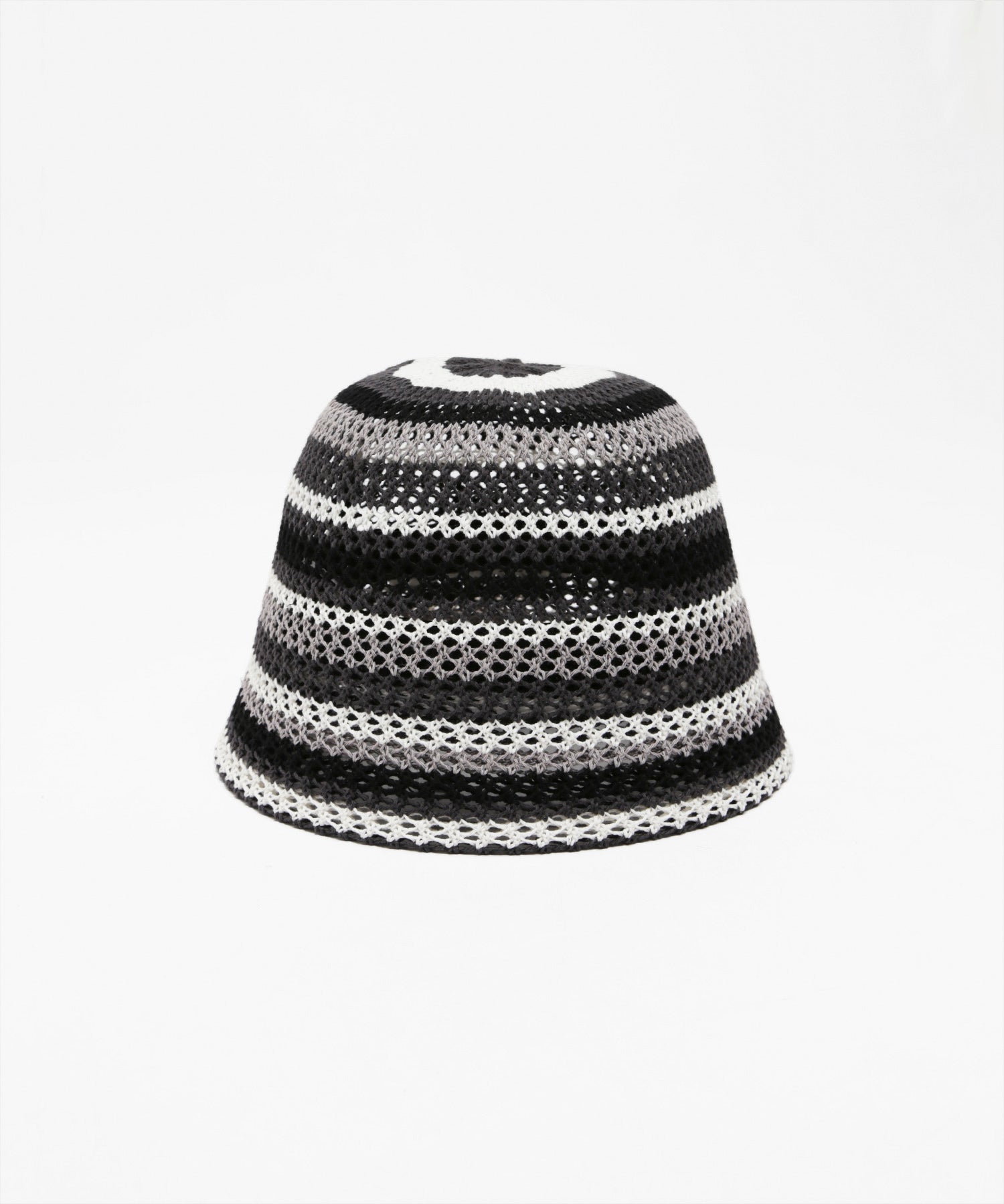 配色のカラフルボーダーで編み上げた下がりツバが特徴的なデザイン。